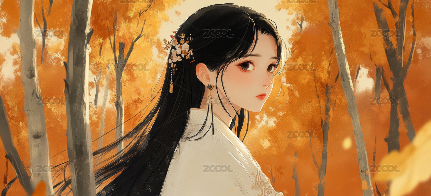 唯美,古风,秋叶,发饰,美丽,漂亮,温柔,绘画,插画,艺术