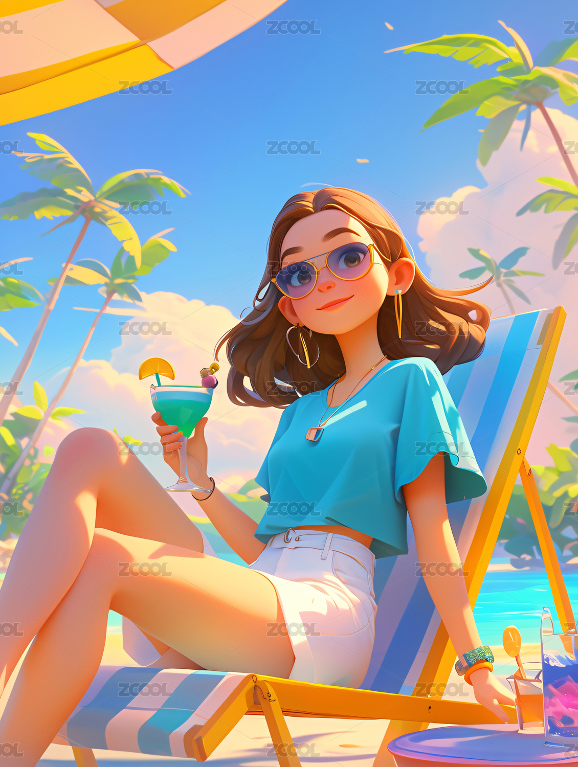 夏日海滩女孩卡通3D渲染图