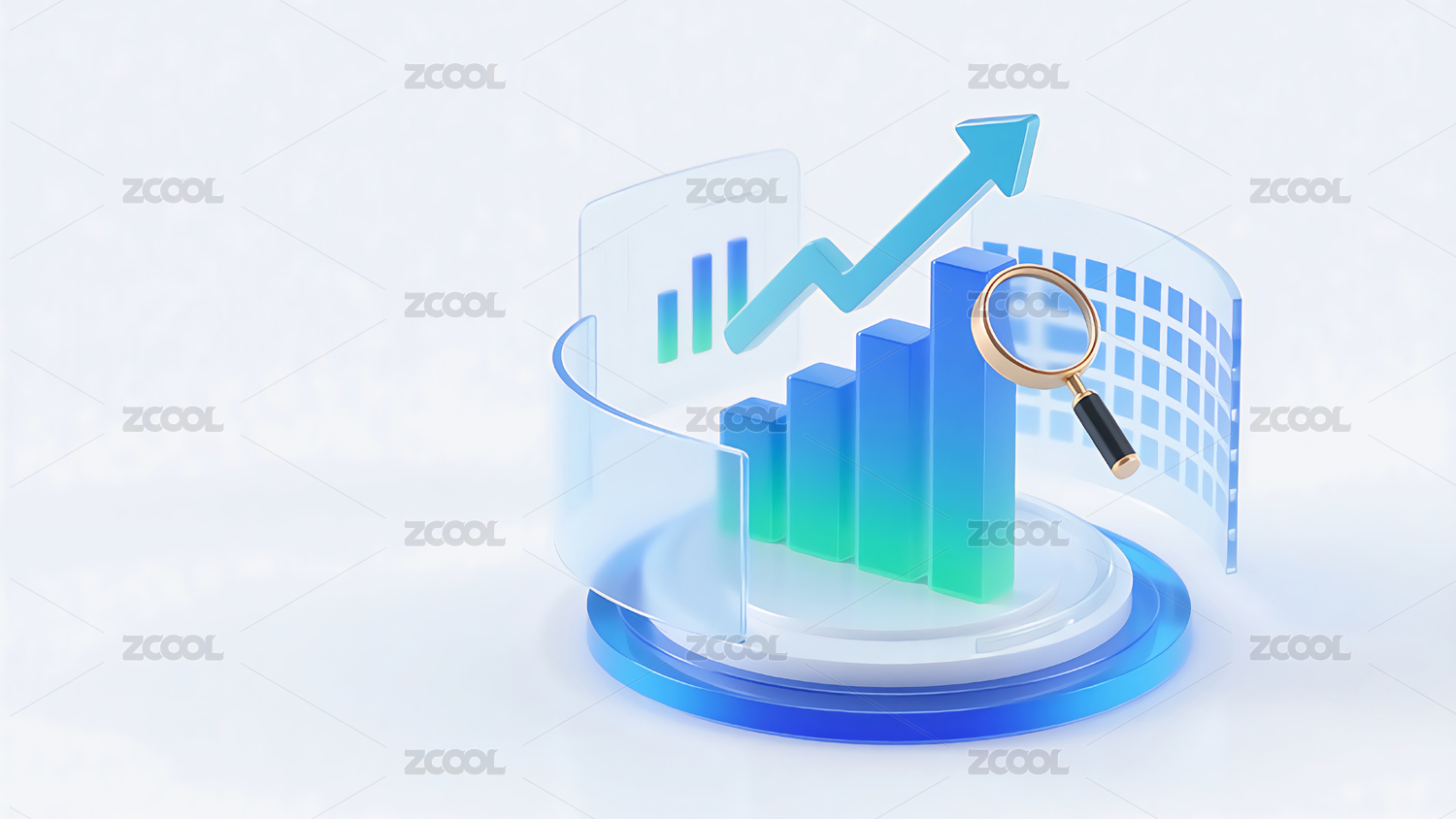 蓝色的放大镜和数据图柱状图背景