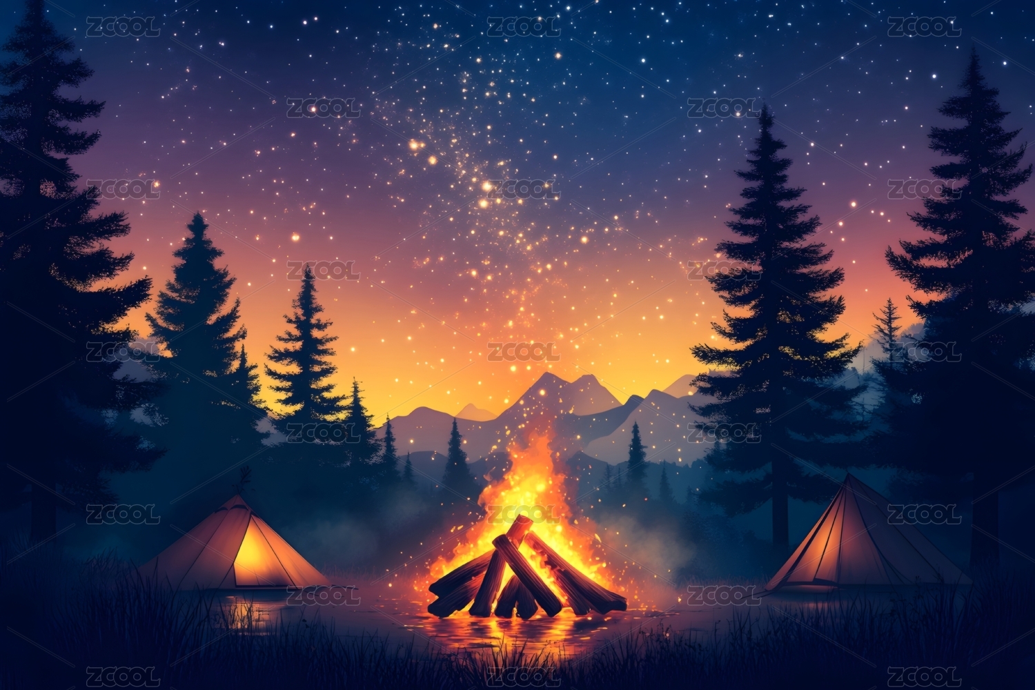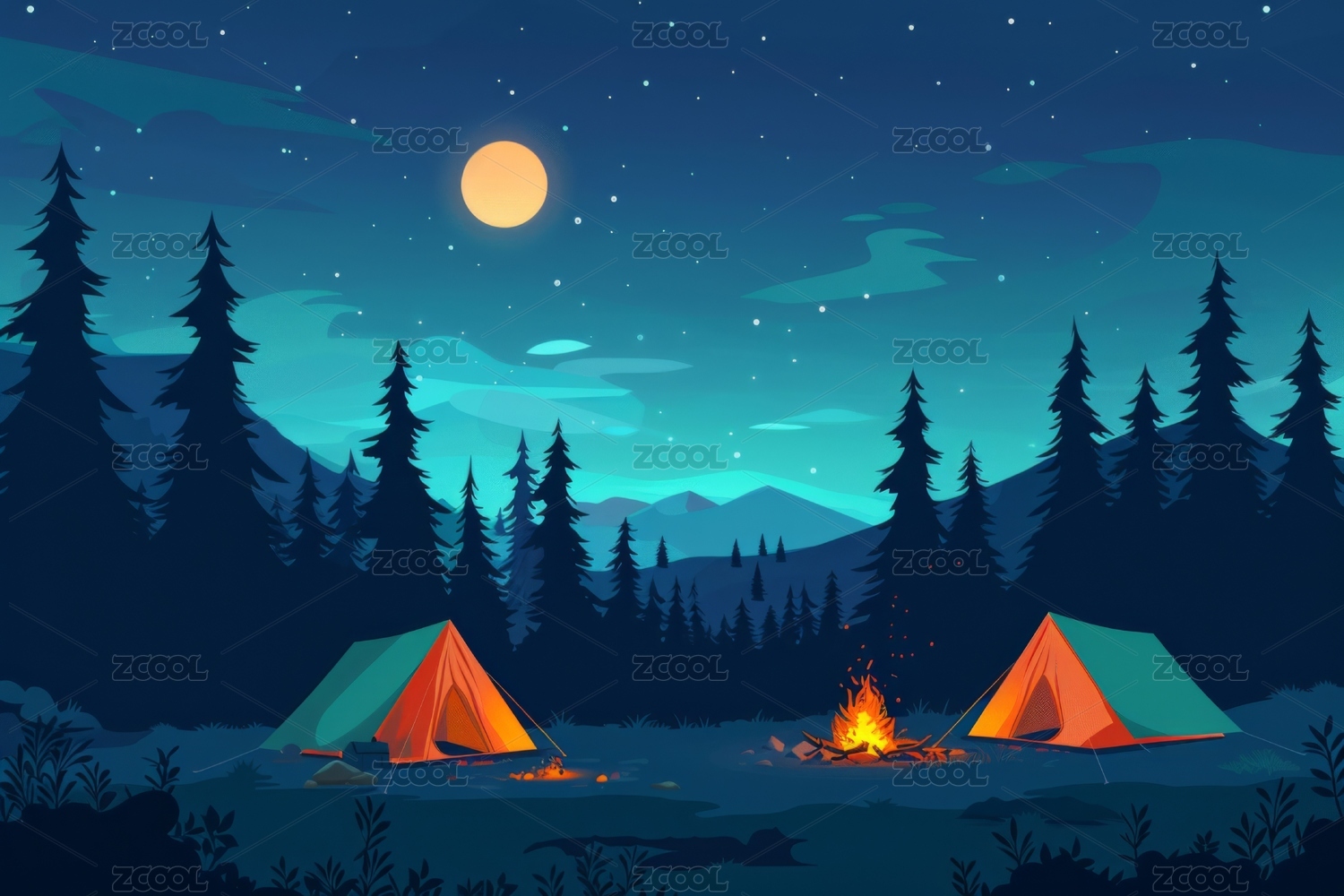 自然,篝火,星光,绿意,光影,温馨,宁静,草地,场景,帐篷