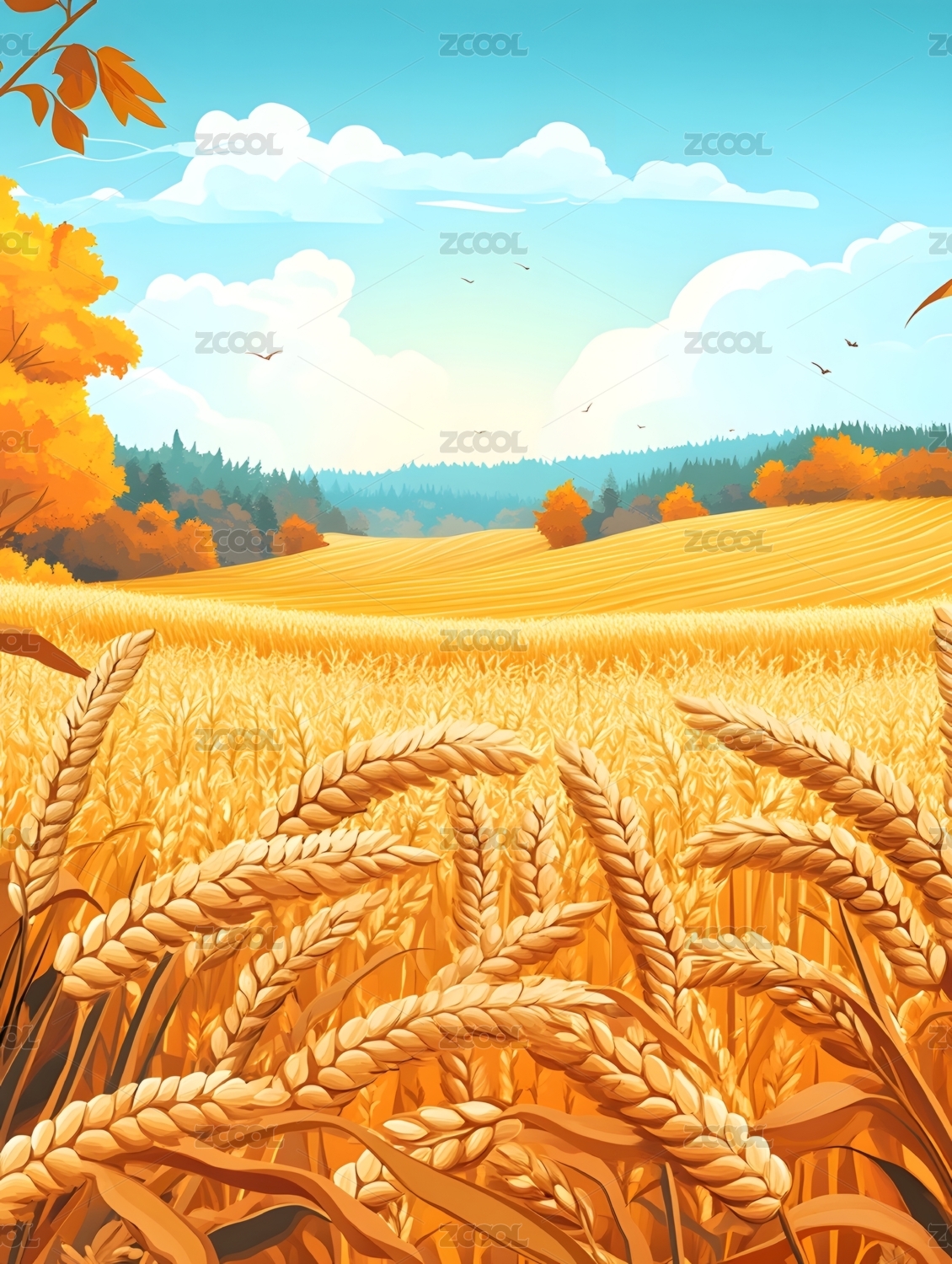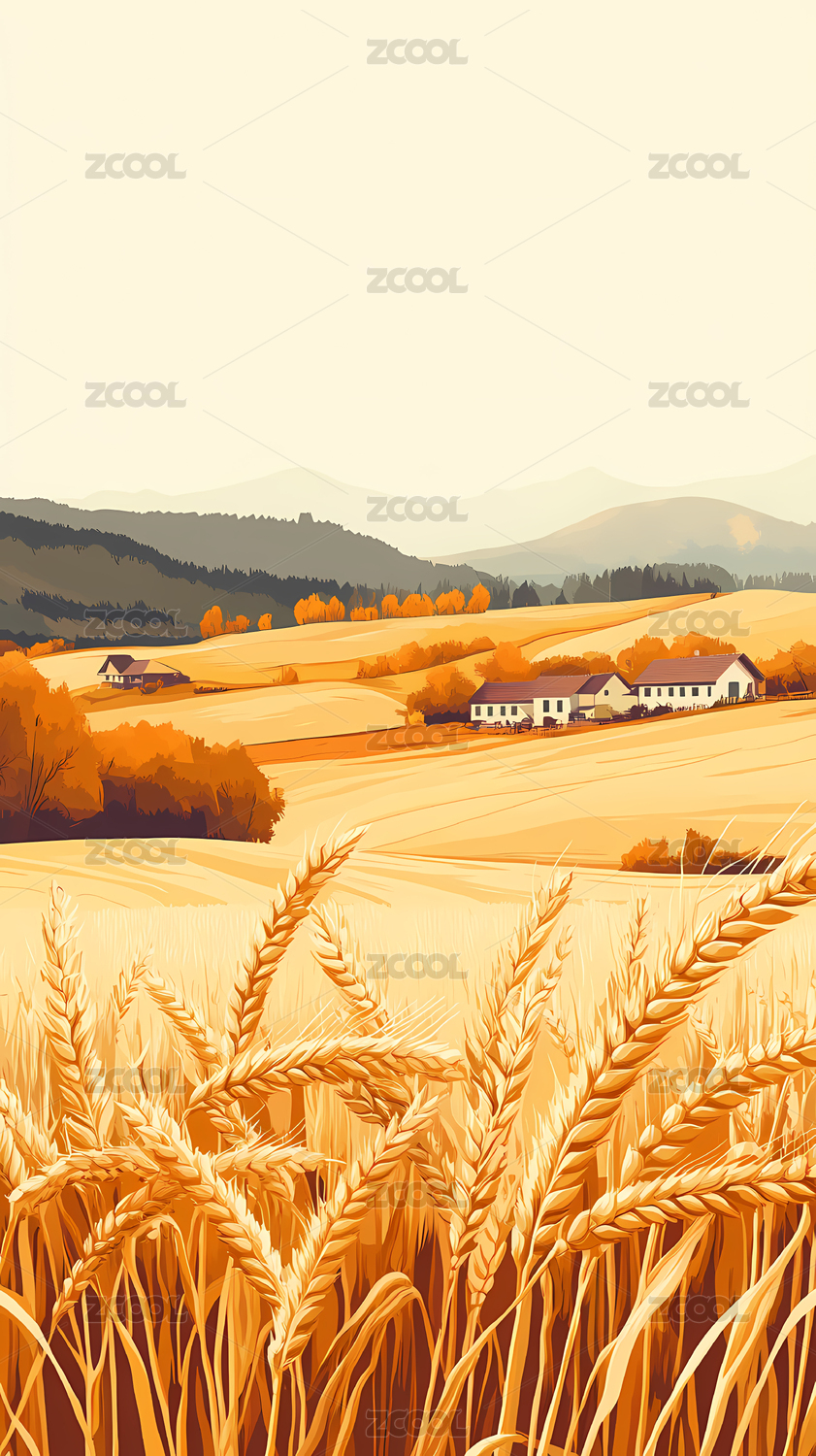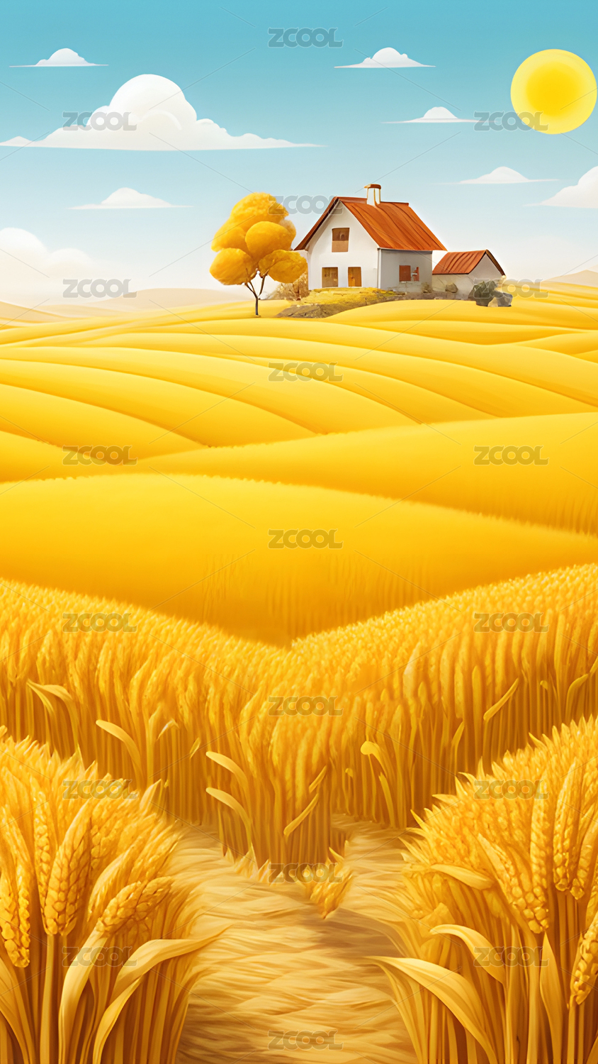 秋天丰收的金色水稻麦子与农庄蓝天白云插画