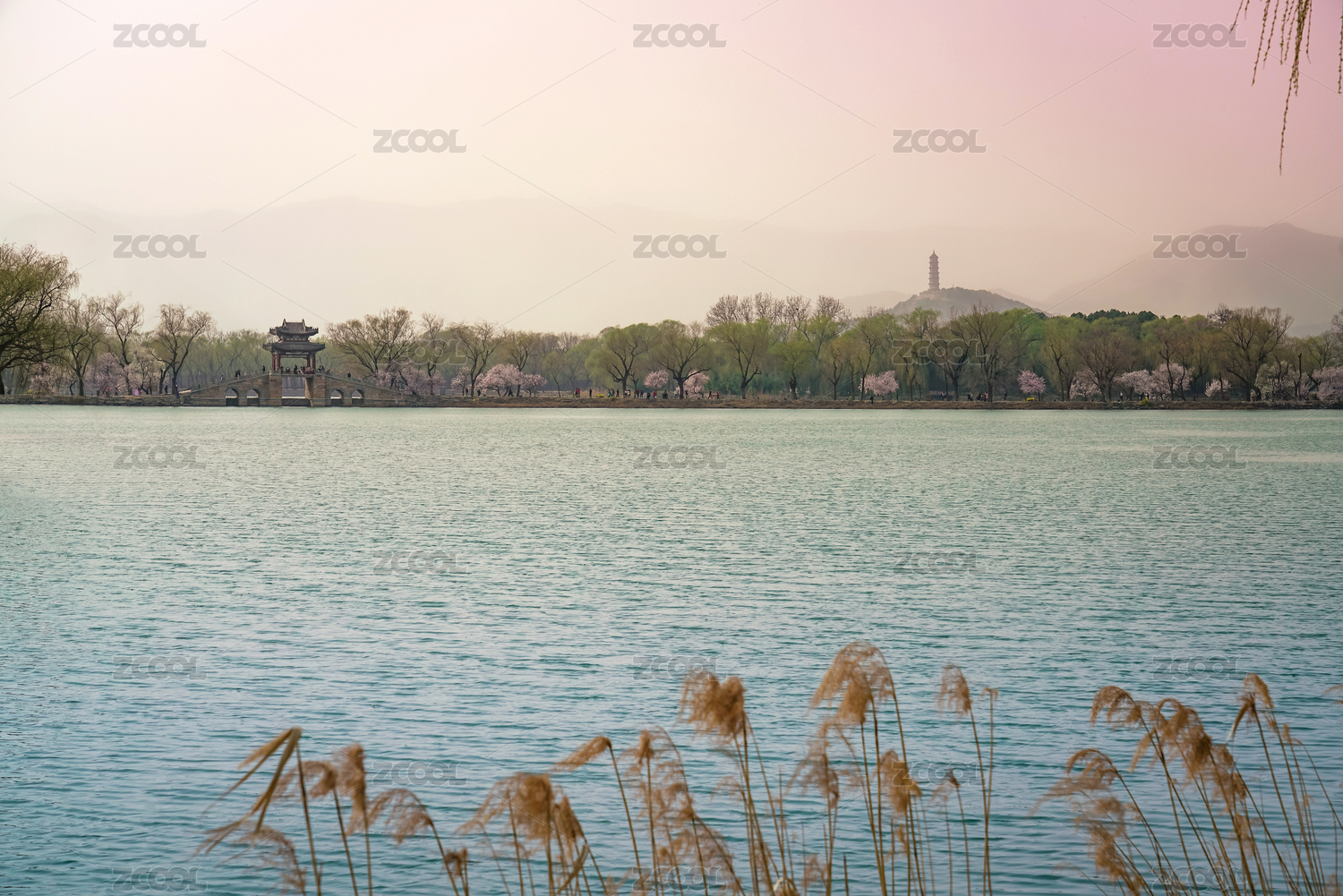 北京市颐和园昆明湖玉峰塔冬季落日风光