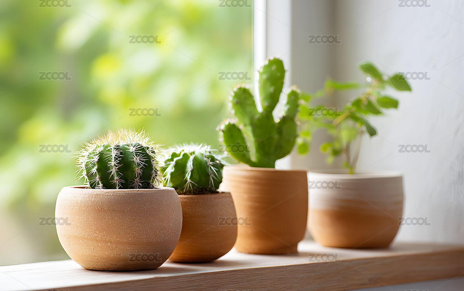 窗台上放着几盆绿色仙人掌盆栽