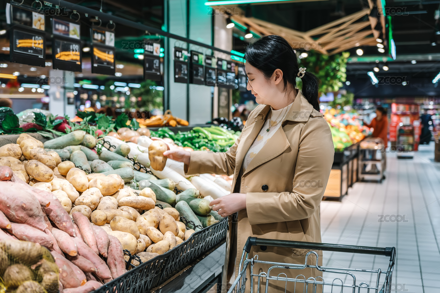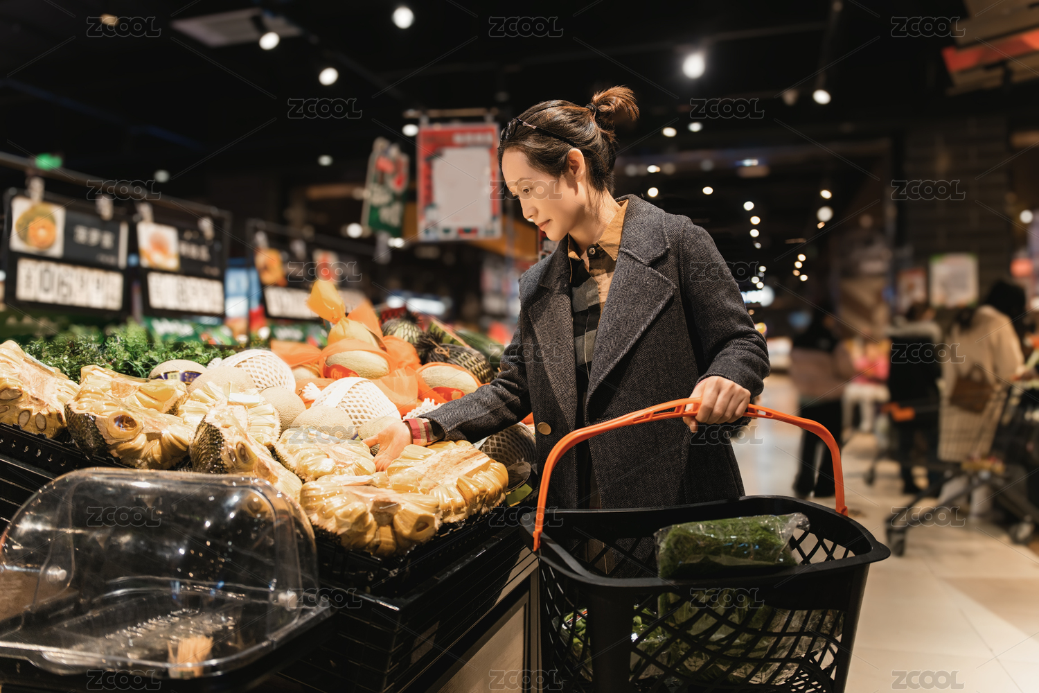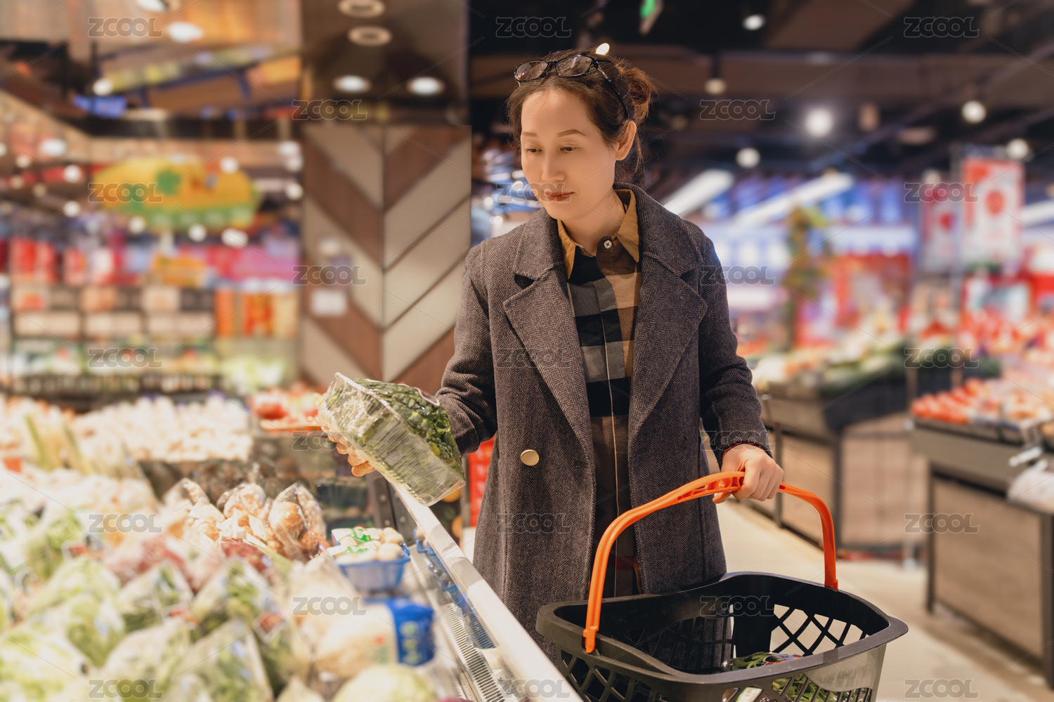 亚洲女孩在超市过道选购新鲜的蔬菜
