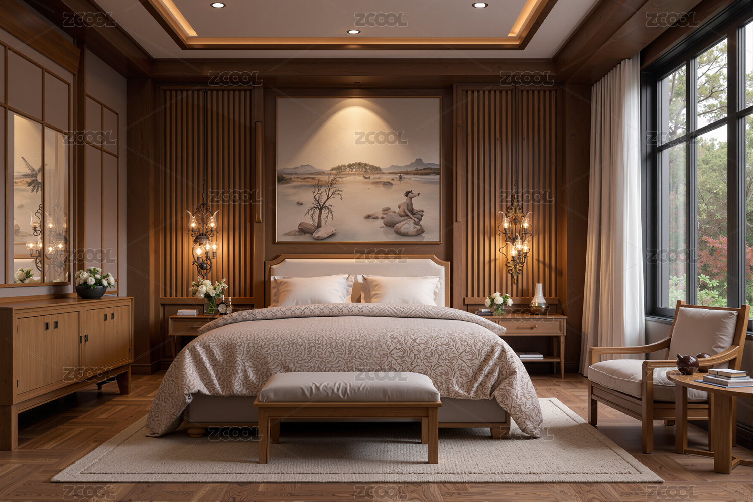 卧室,床,中式风格,现代简约,装修设计,家居,室内设计,木质,家具,灯