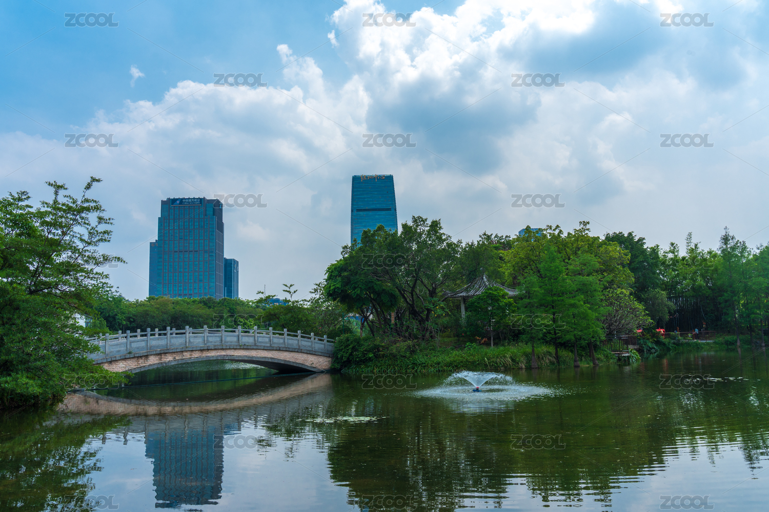 中国广东深圳莲花山公园湖水倒影蓝天白云