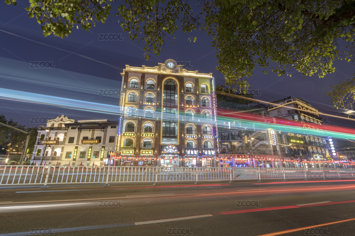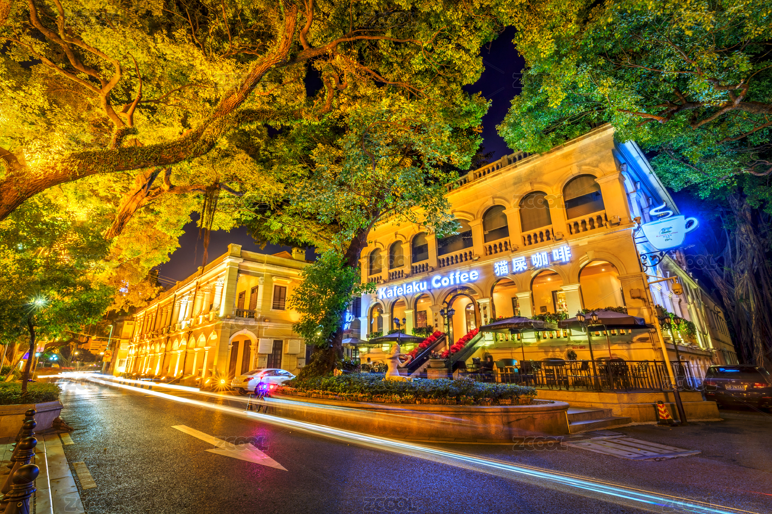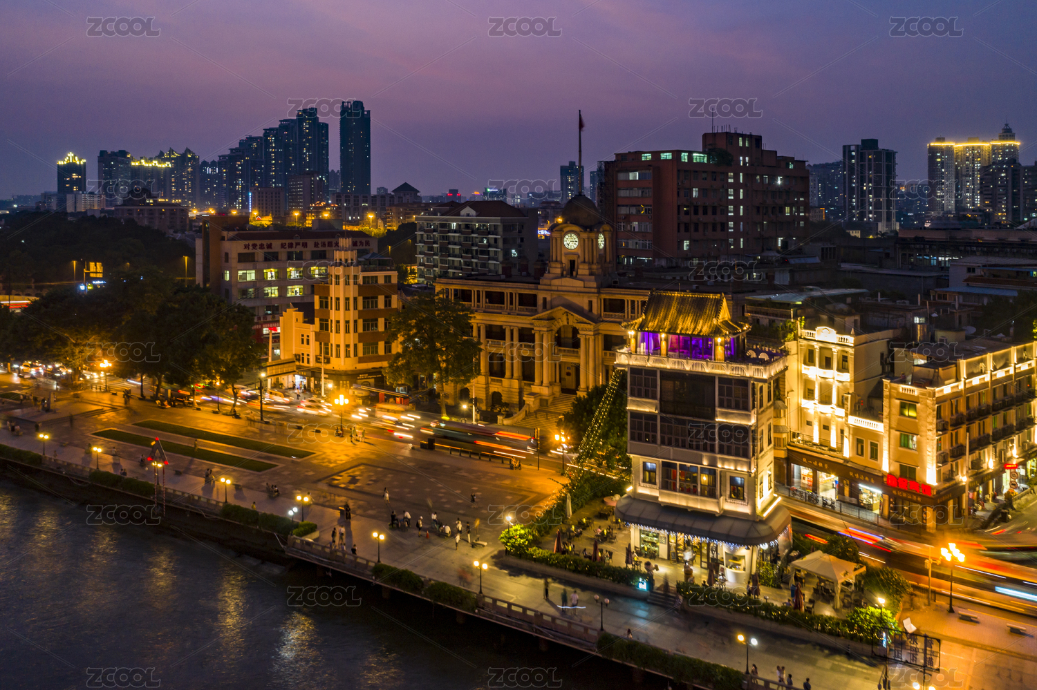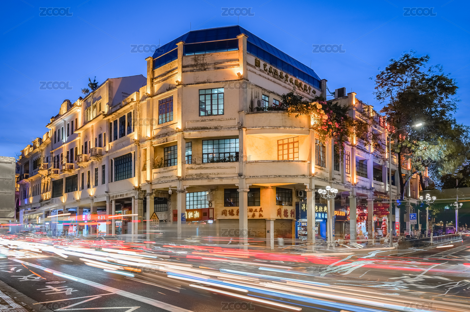 街边亮灯的民国风建筑群及车流,福建龙岩