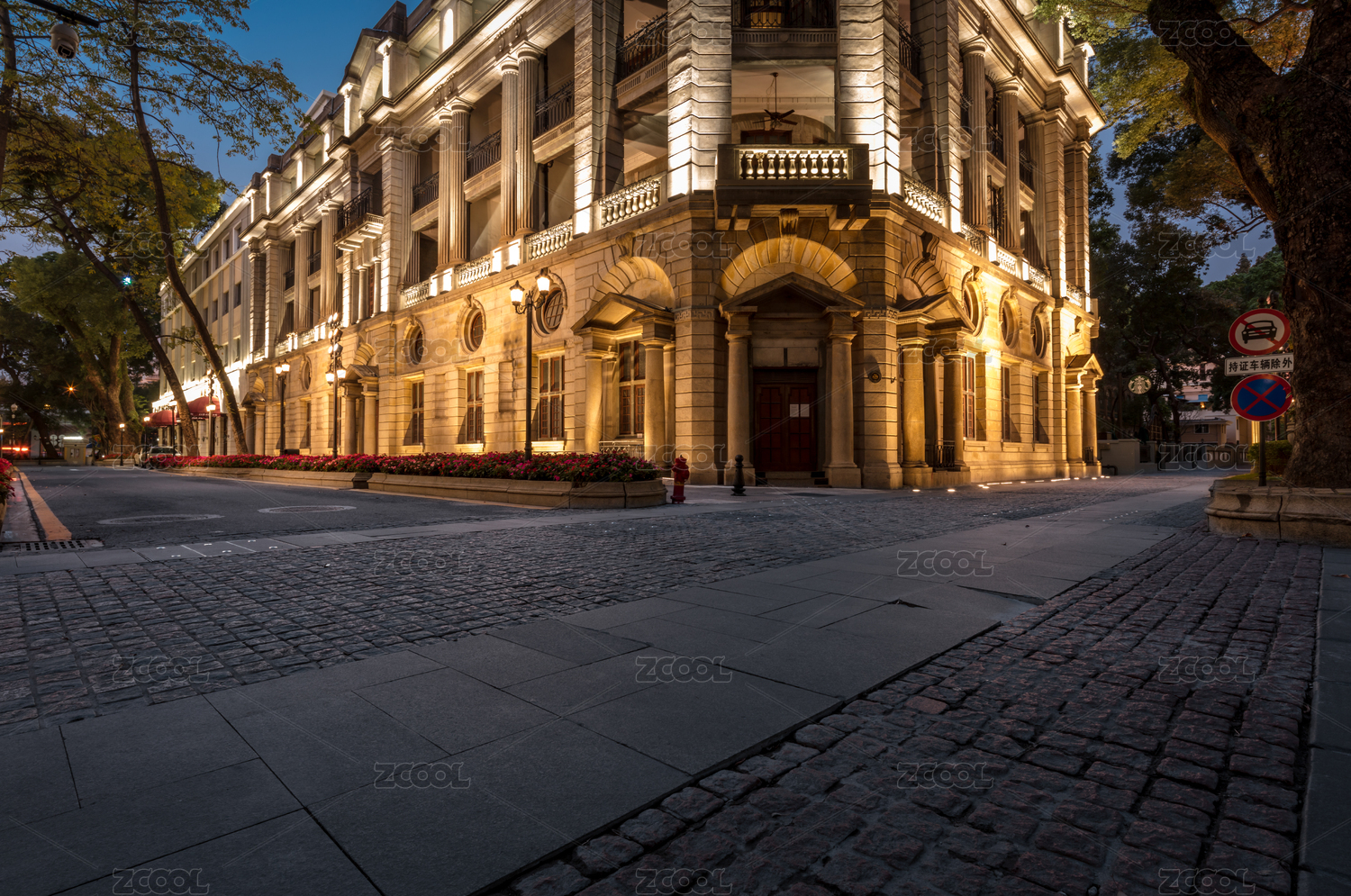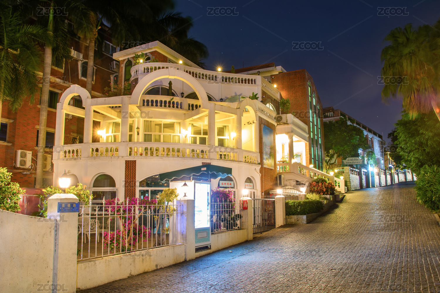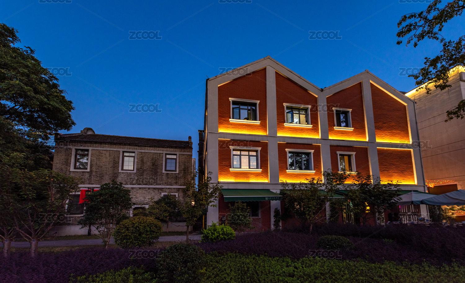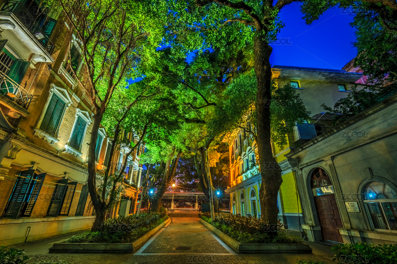 街边亮灯的民国风建筑群及车流,福建龙岩