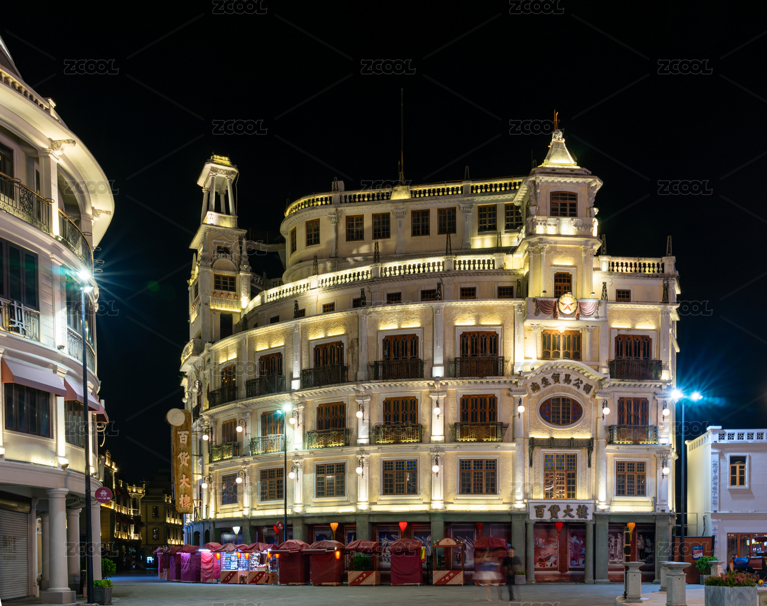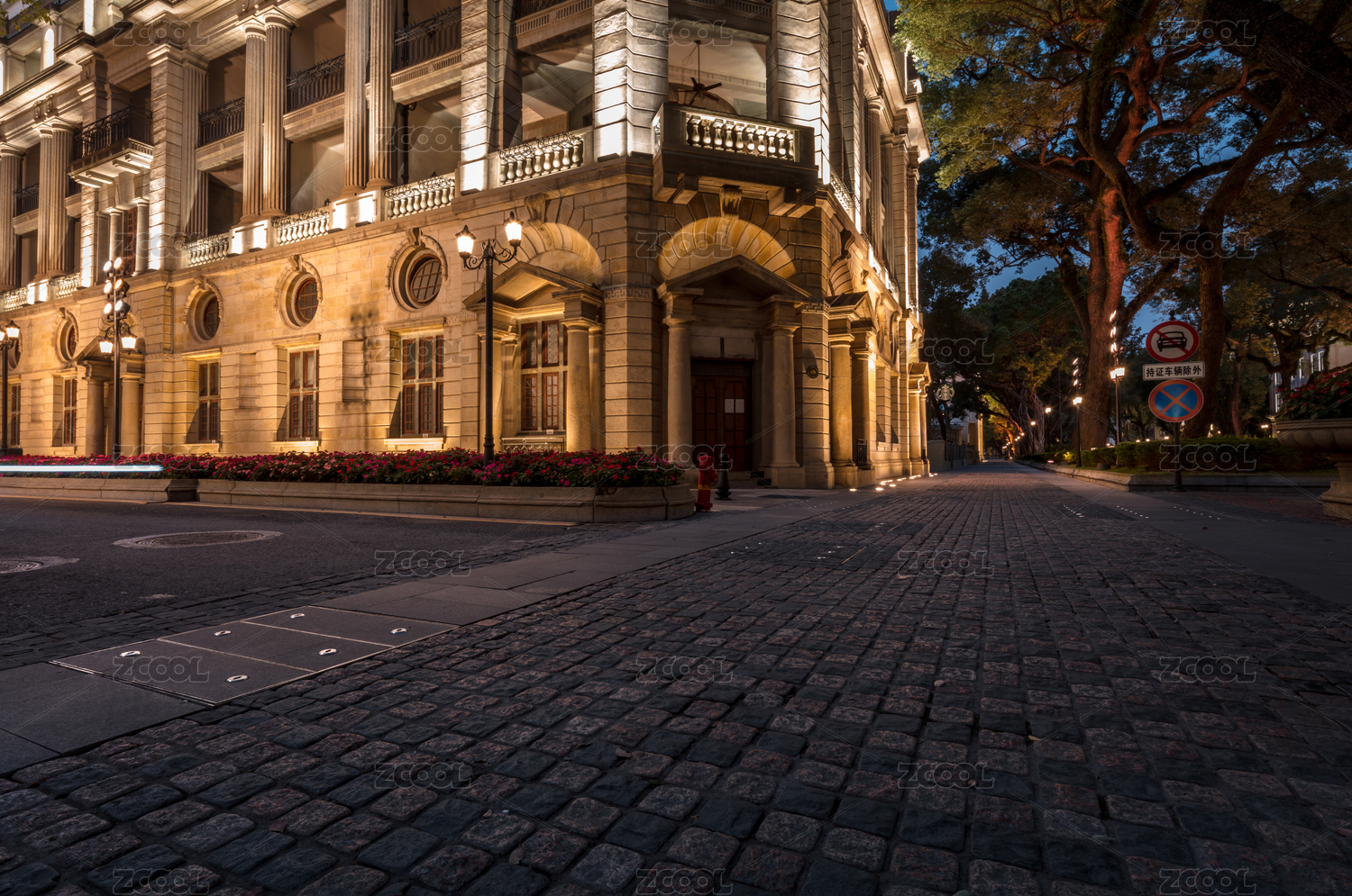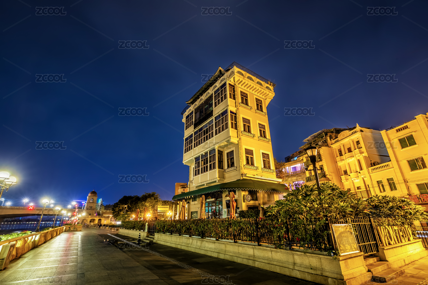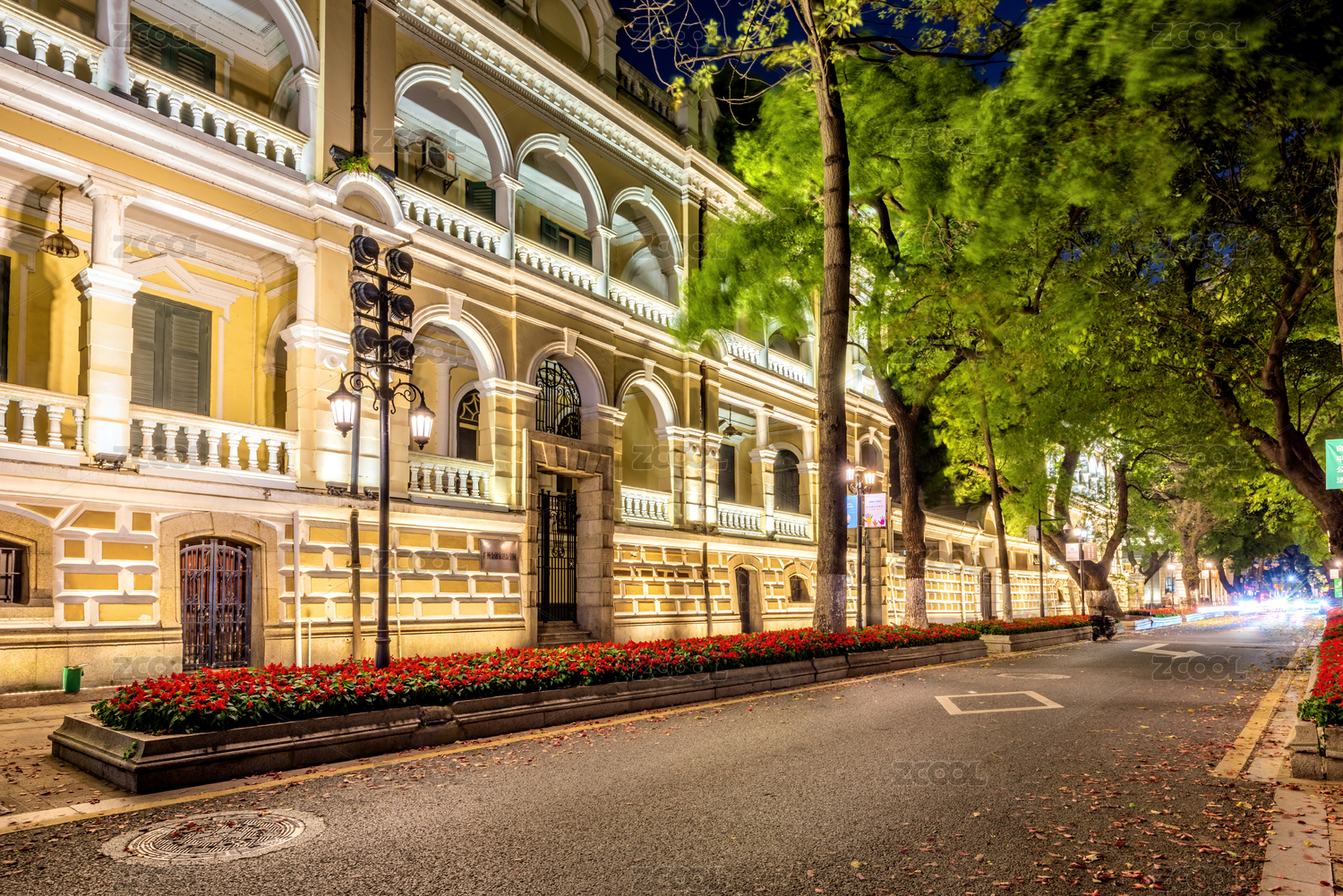 街边亮灯的民国风建筑群及车流,福建龙岩