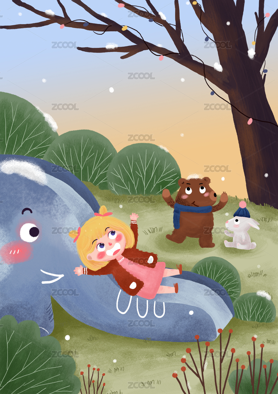 夏日傍晚小女孩与小怪兽梦幻场景插画