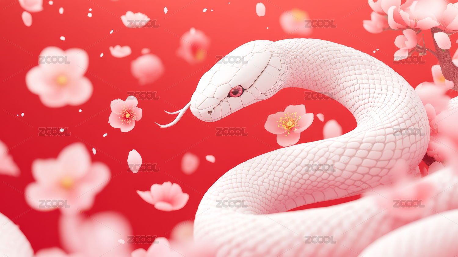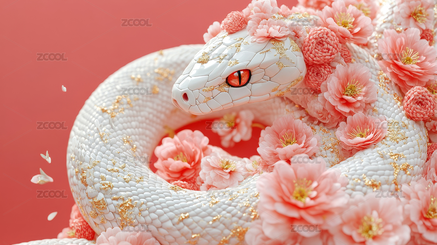 红色花朵中的白色小蛇