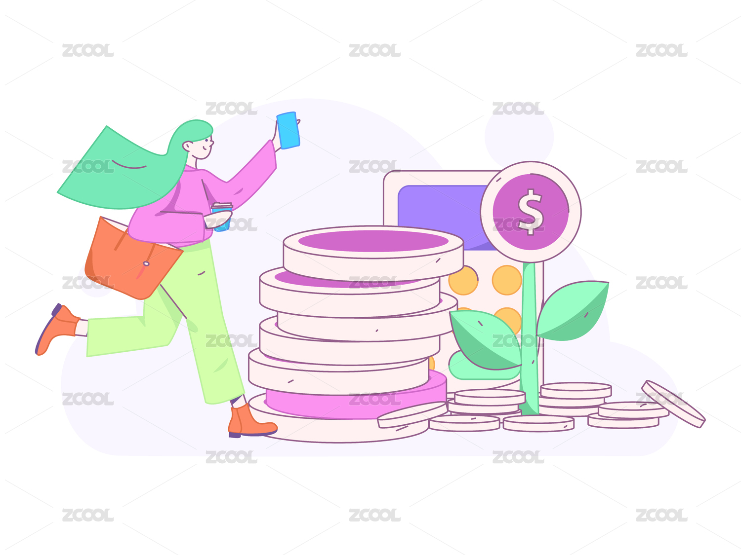卡通手绘金融扁平插画女人储蓄存钱猪插画