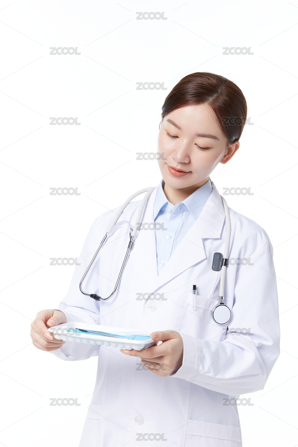 影棚拍摄青年女医生形象。年轻女大夫肖像