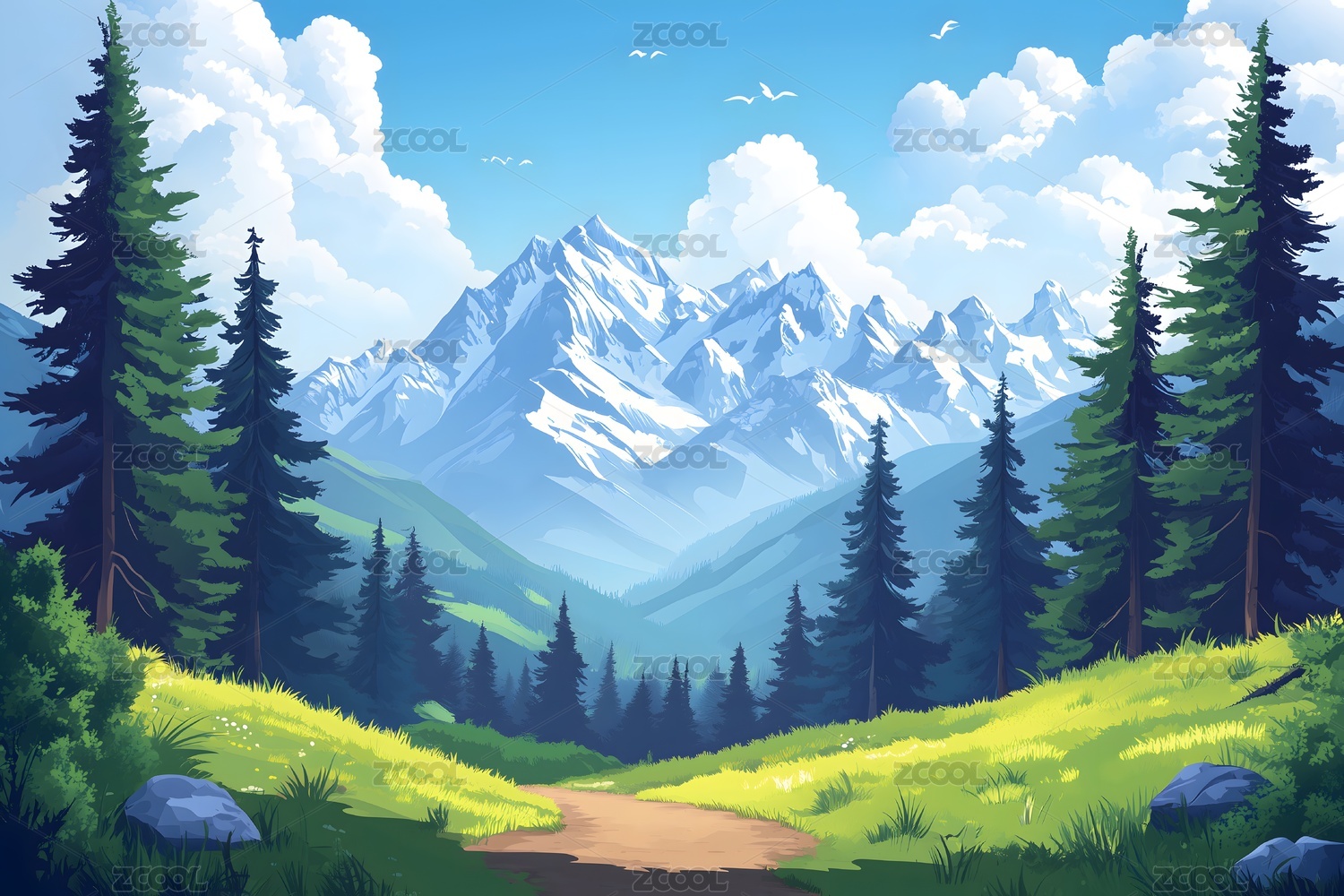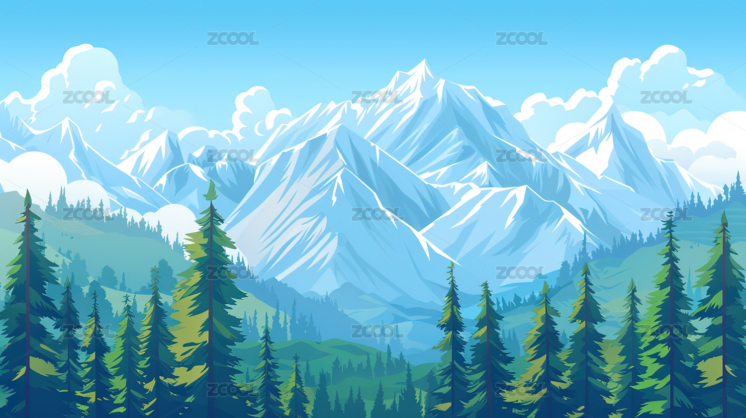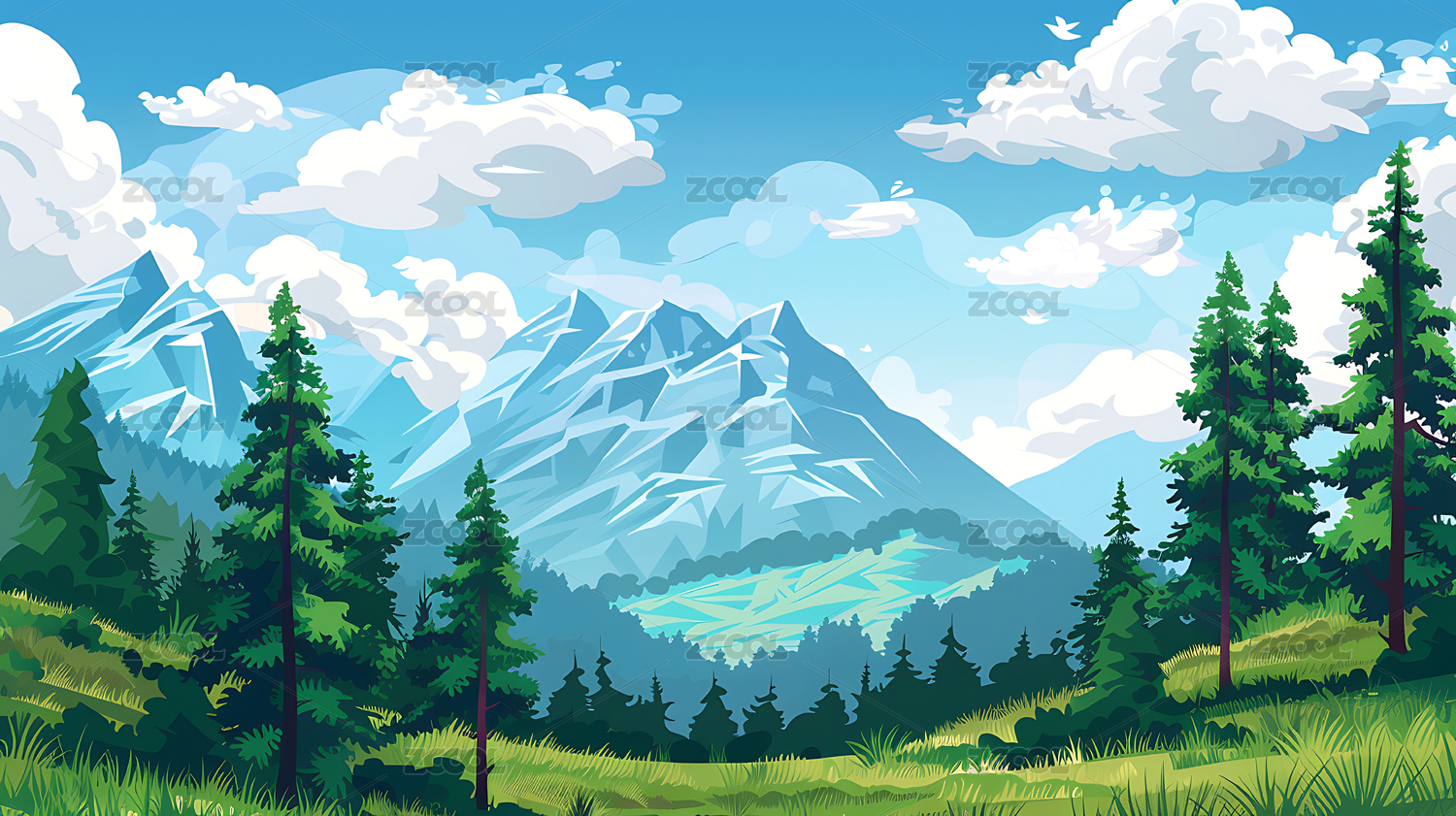 自然,风景,插图,绿色,丘陵,花朵,松树,雪山,背景,蓝天