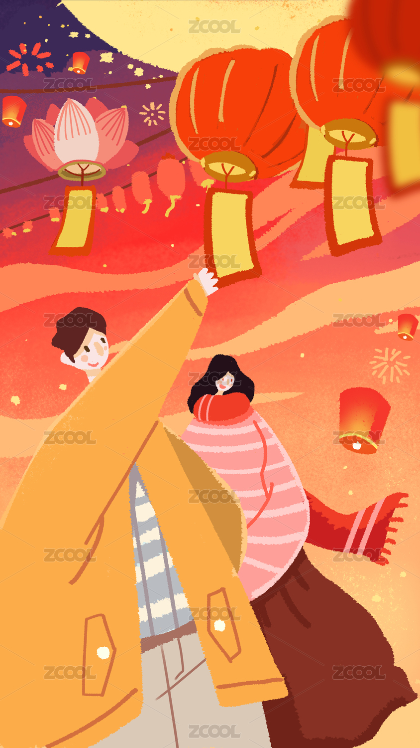 元宵节情侣夜晚赏灯猜灯谜赏月节日插画