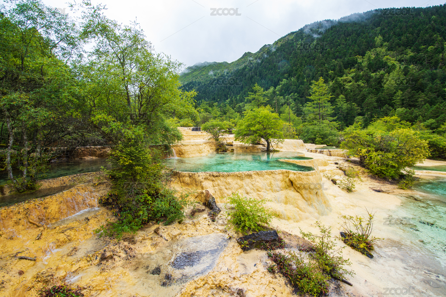 四川,黄龙,雨天,靛蓝,树木,瑶池,五彩池,彩池,水,地质
