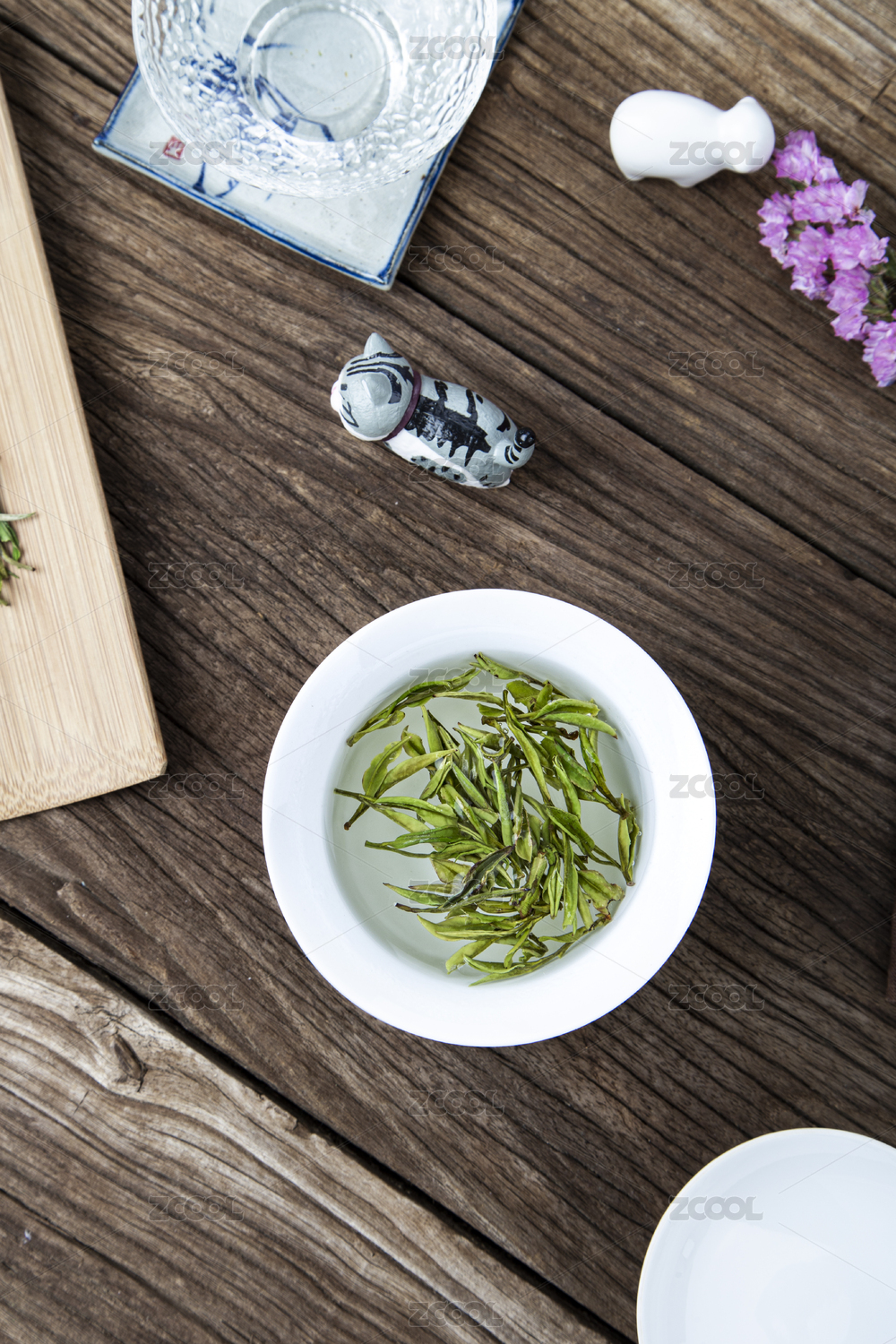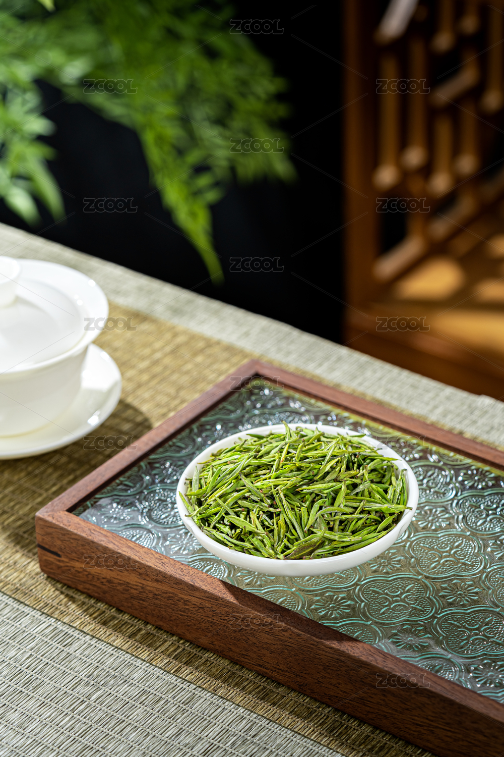 木板上的明前毛峰白瓷盖碗冲泡展示