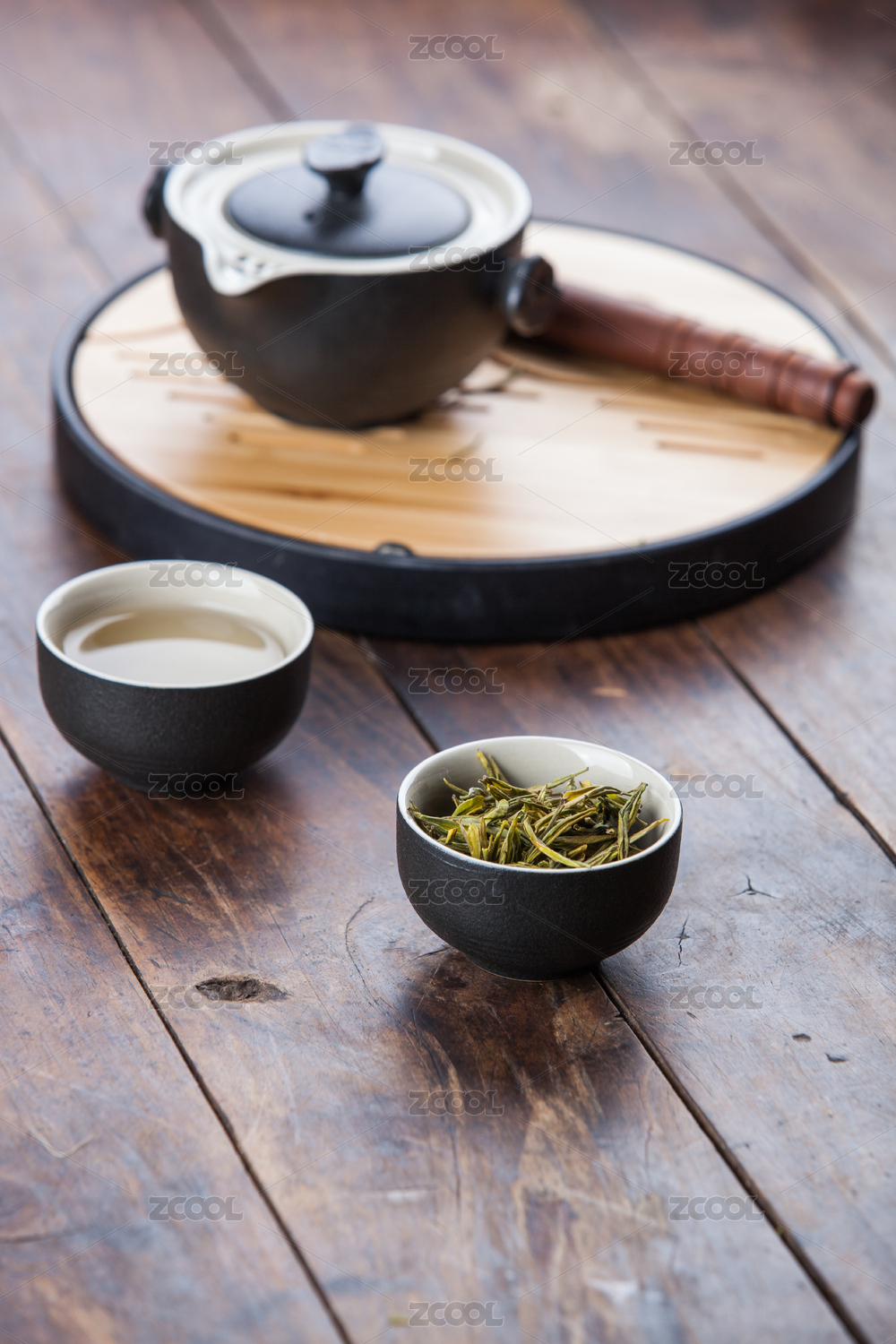 纹理木桌上摆放的茶艺茶具