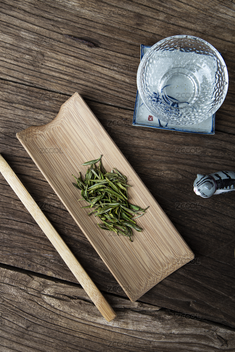 木质背景上的安吉白茶茶叶与茶具