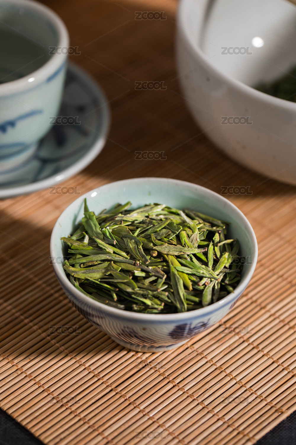 复古碗装着的中国茗茶竹叶青干茶叶