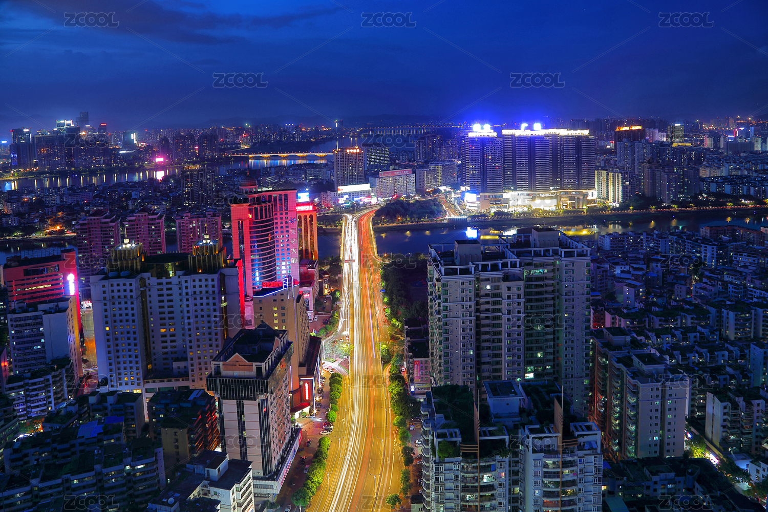 中国广东省东莞市石龙镇航拍视角都市夜景风光