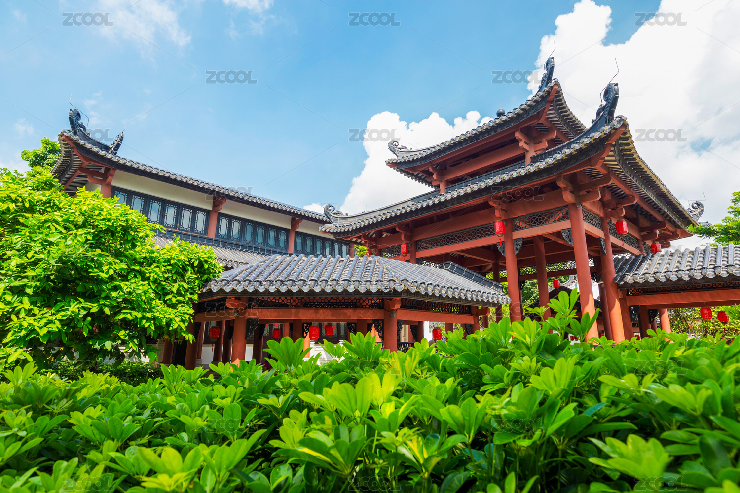广西南宁狮山公园湖泊树林与竹影楼风雨桥