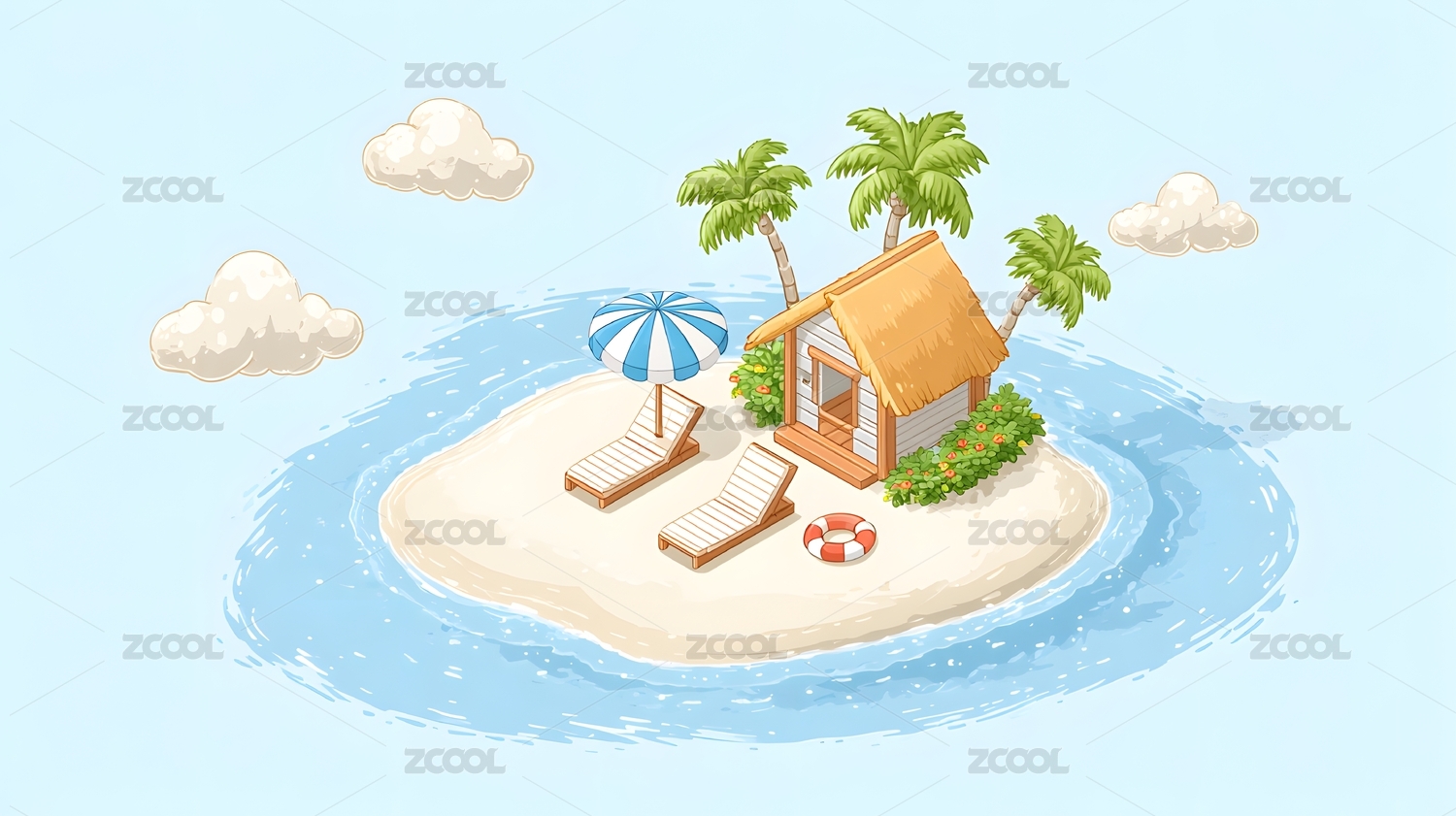 海岛小屋躺椅遮阳伞惬意场景