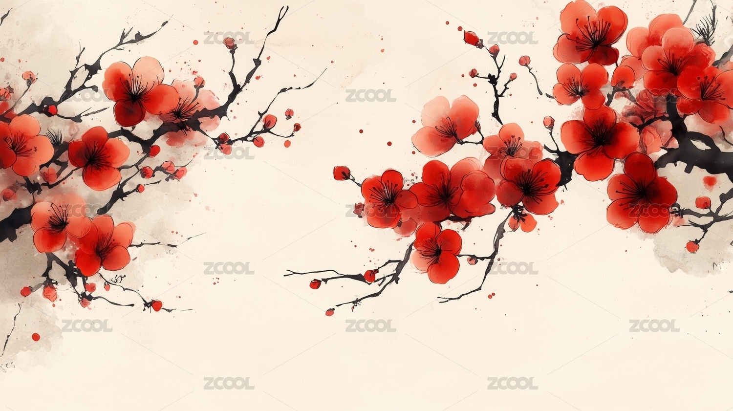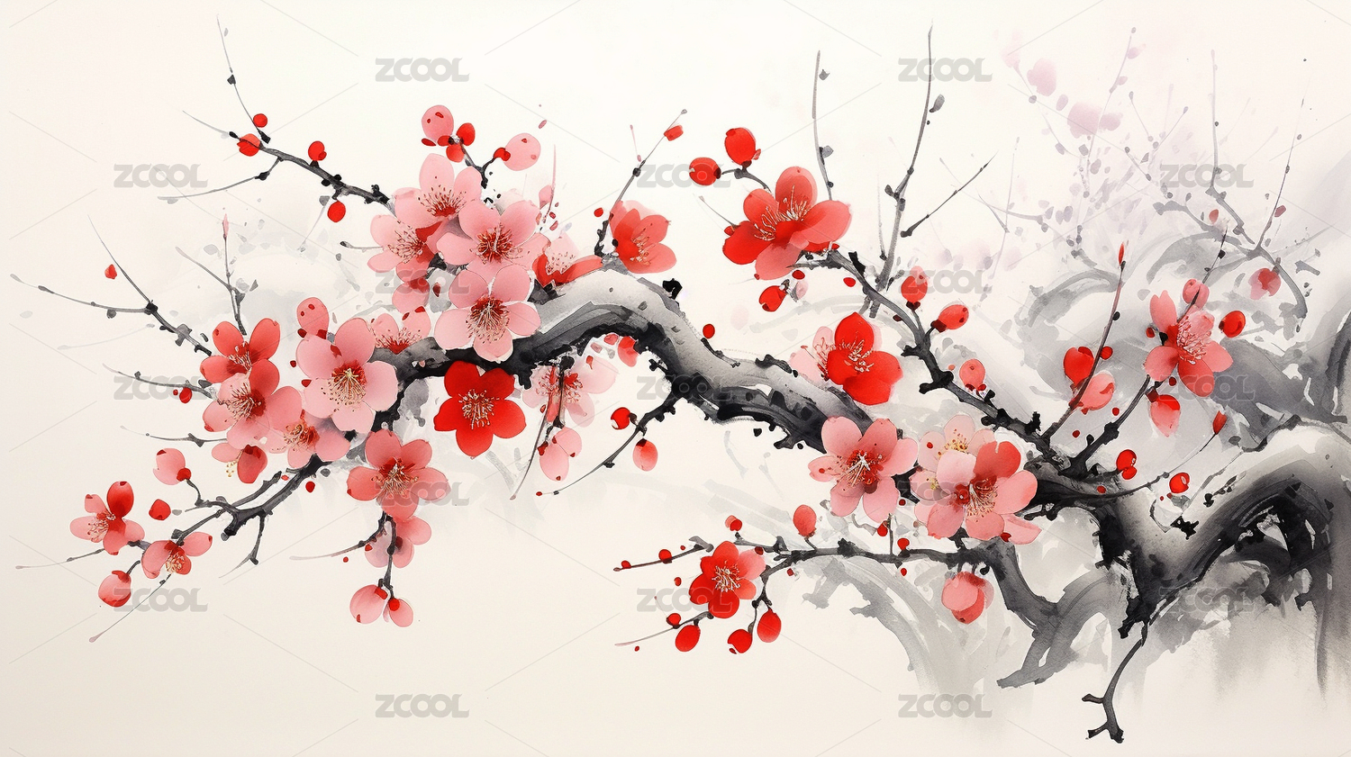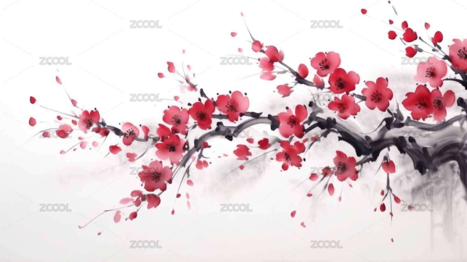 盛开的桃花花枝水墨风手绘水彩插画素材