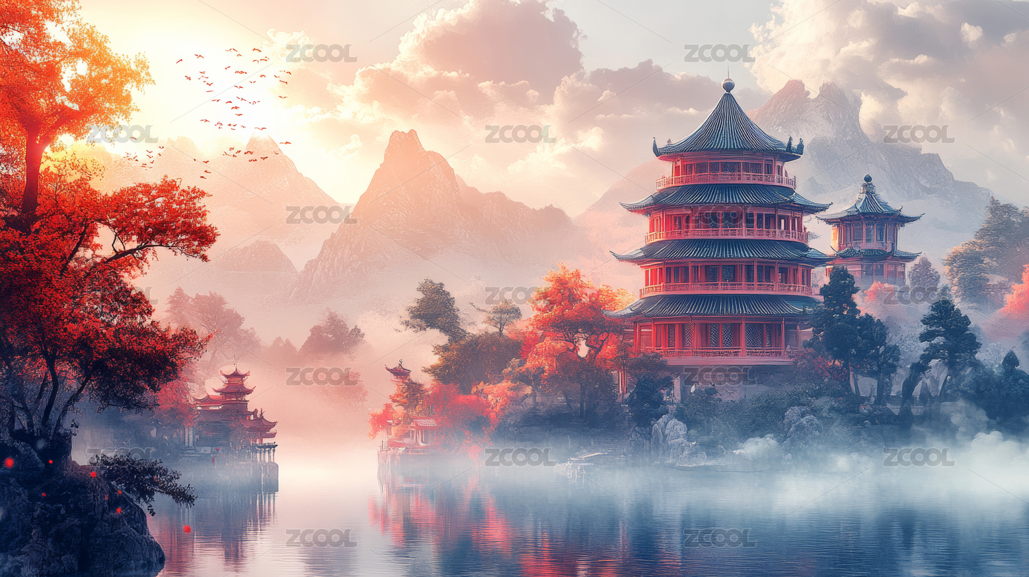 AIGC202407,中国风,国潮风,天宫,仙宫,建筑,风景,插画