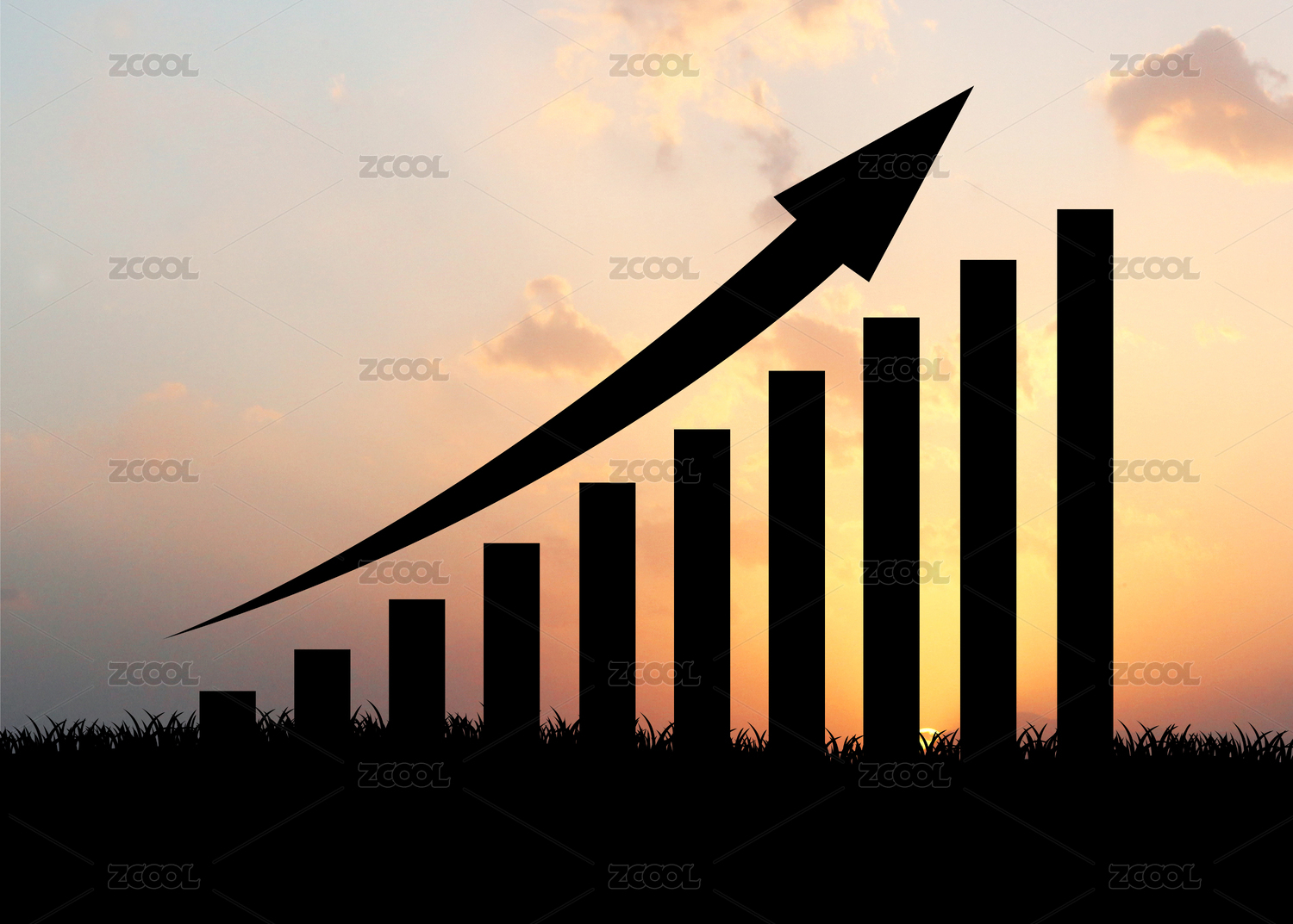 日落背景前的剪影草地上递增的条形图及辅助的上涨箭头和谢克尔符号