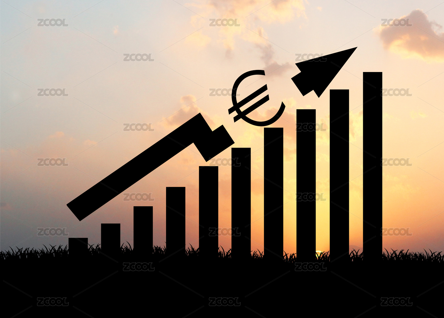 日落背景前的剪影草地上递增的条形图及辅助的上涨箭头和欧元符号