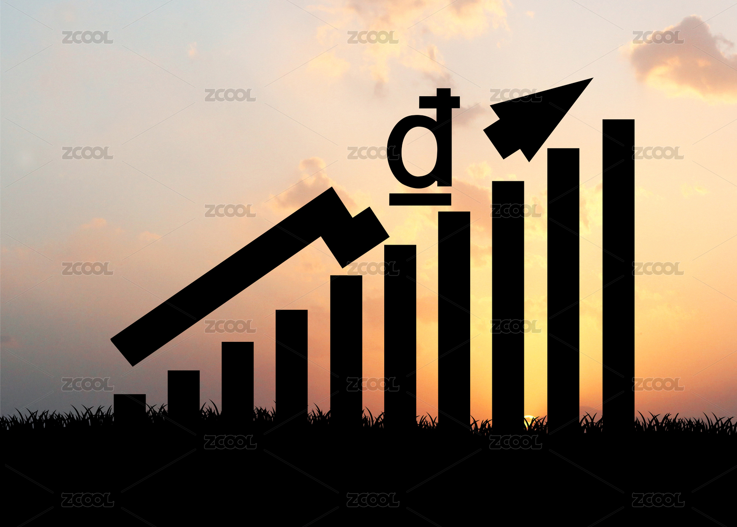 日落背景前的剪影草地上递增的条形图及辅助的上涨箭头和越南盾符号