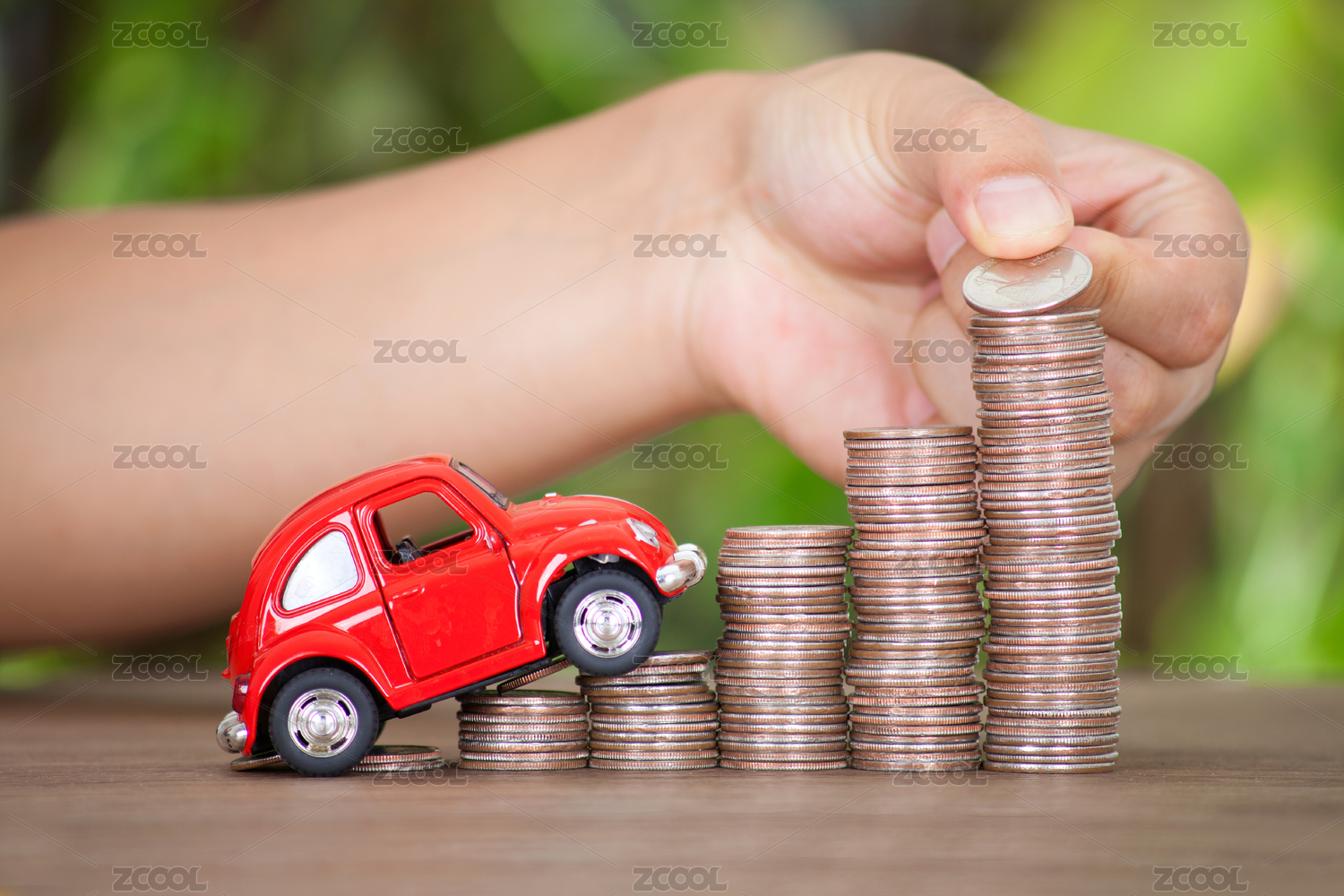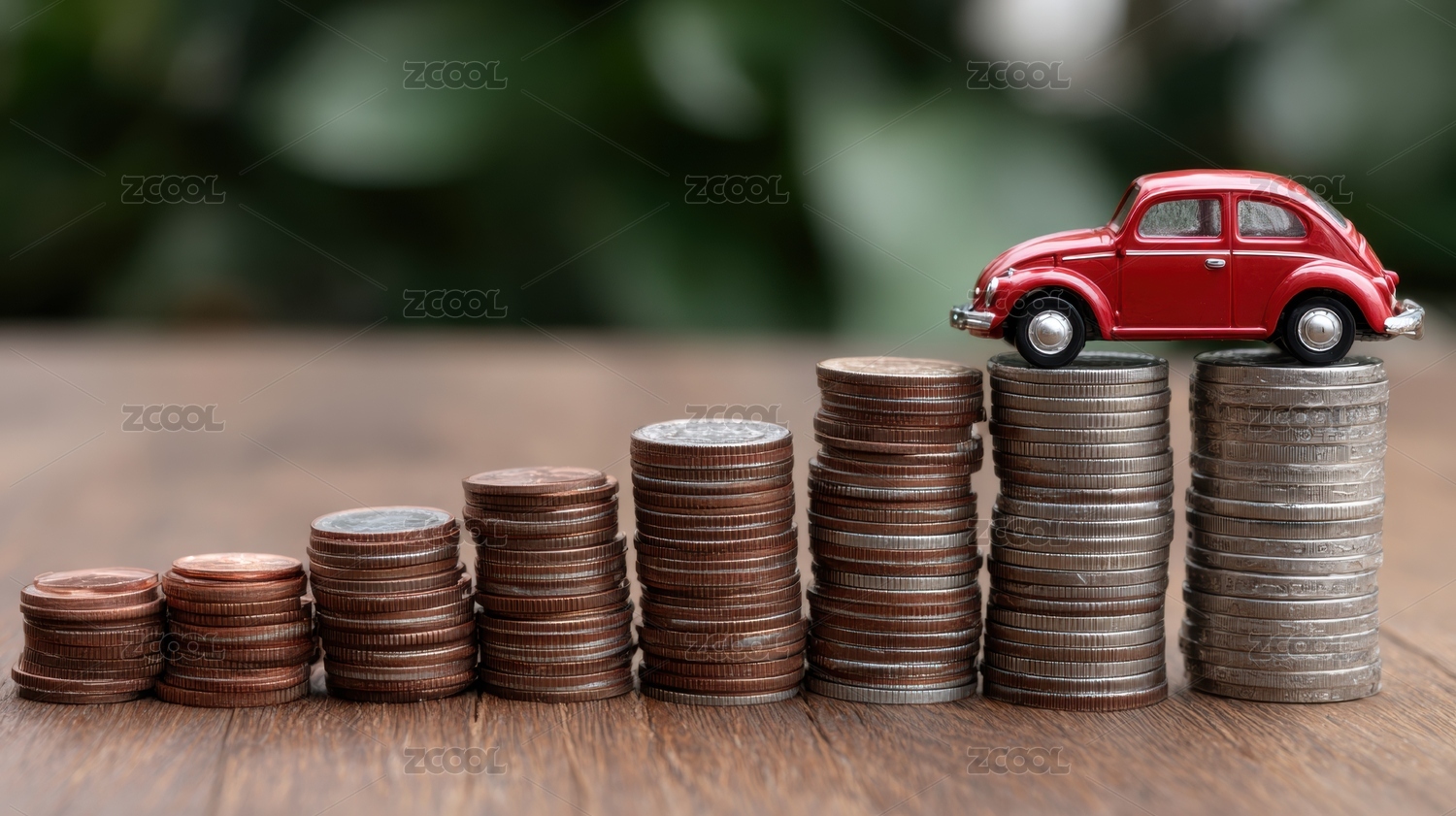 硬币堆叠上的红色小汽车