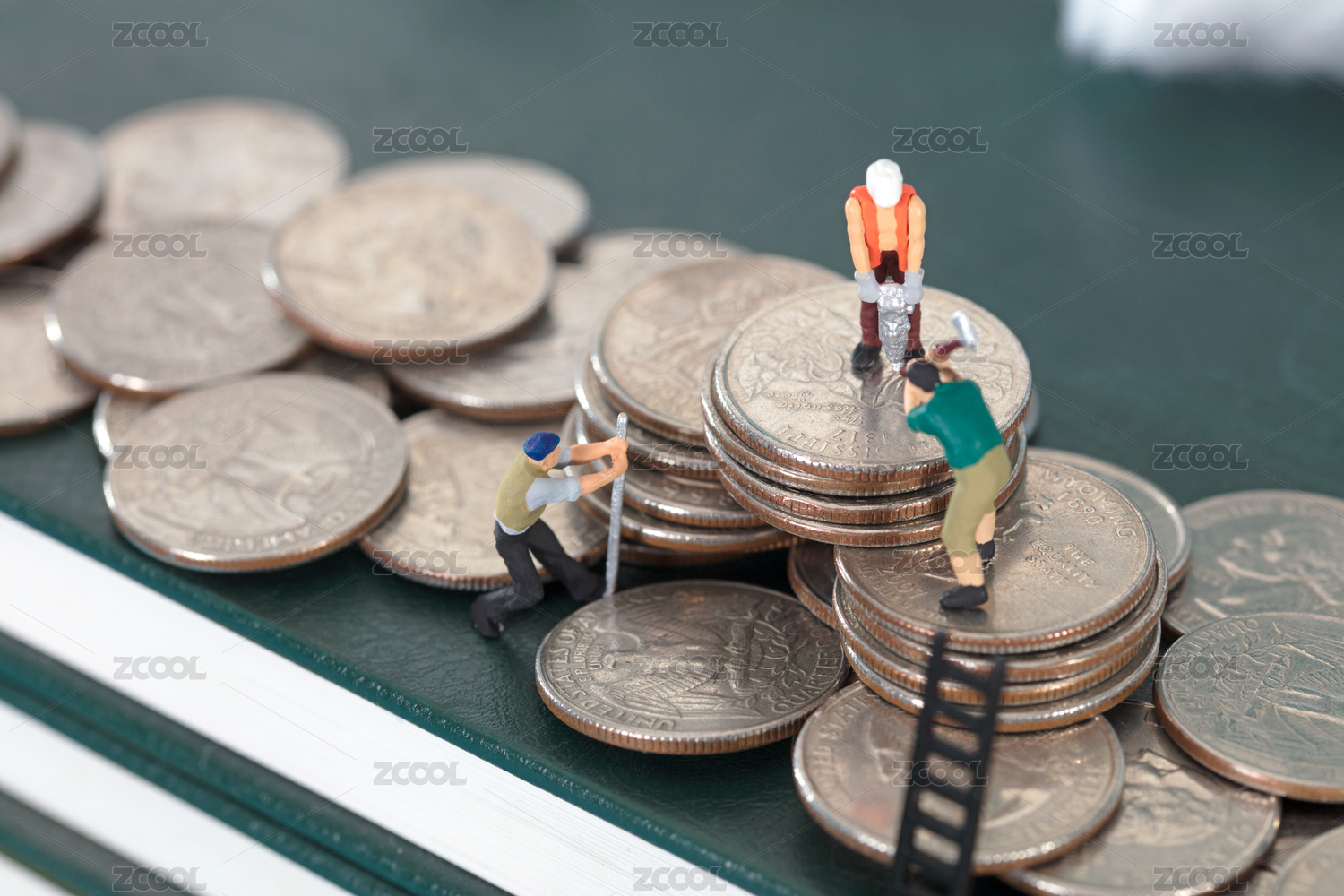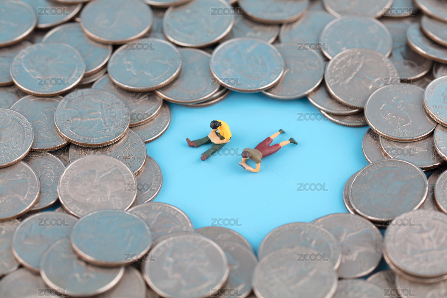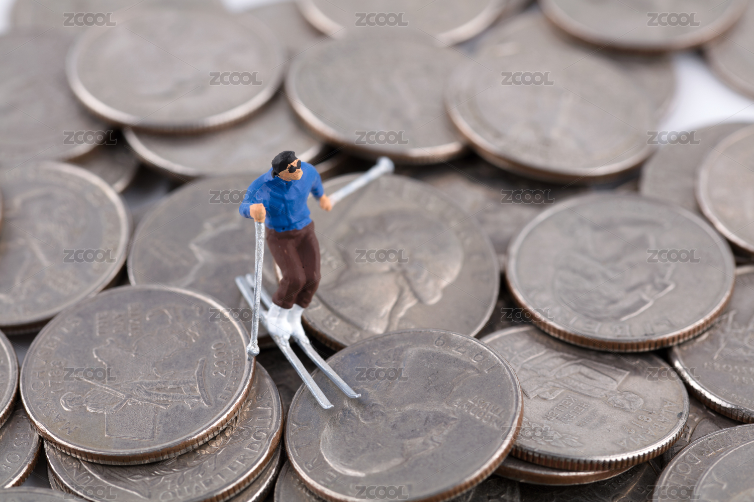 微缩创意一堆硬币上滑雪