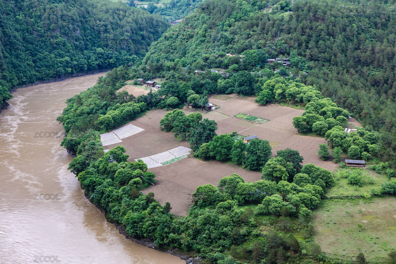 航拍澜沧江和旁边的小村寨