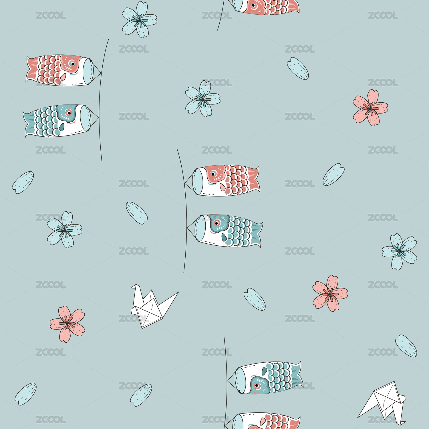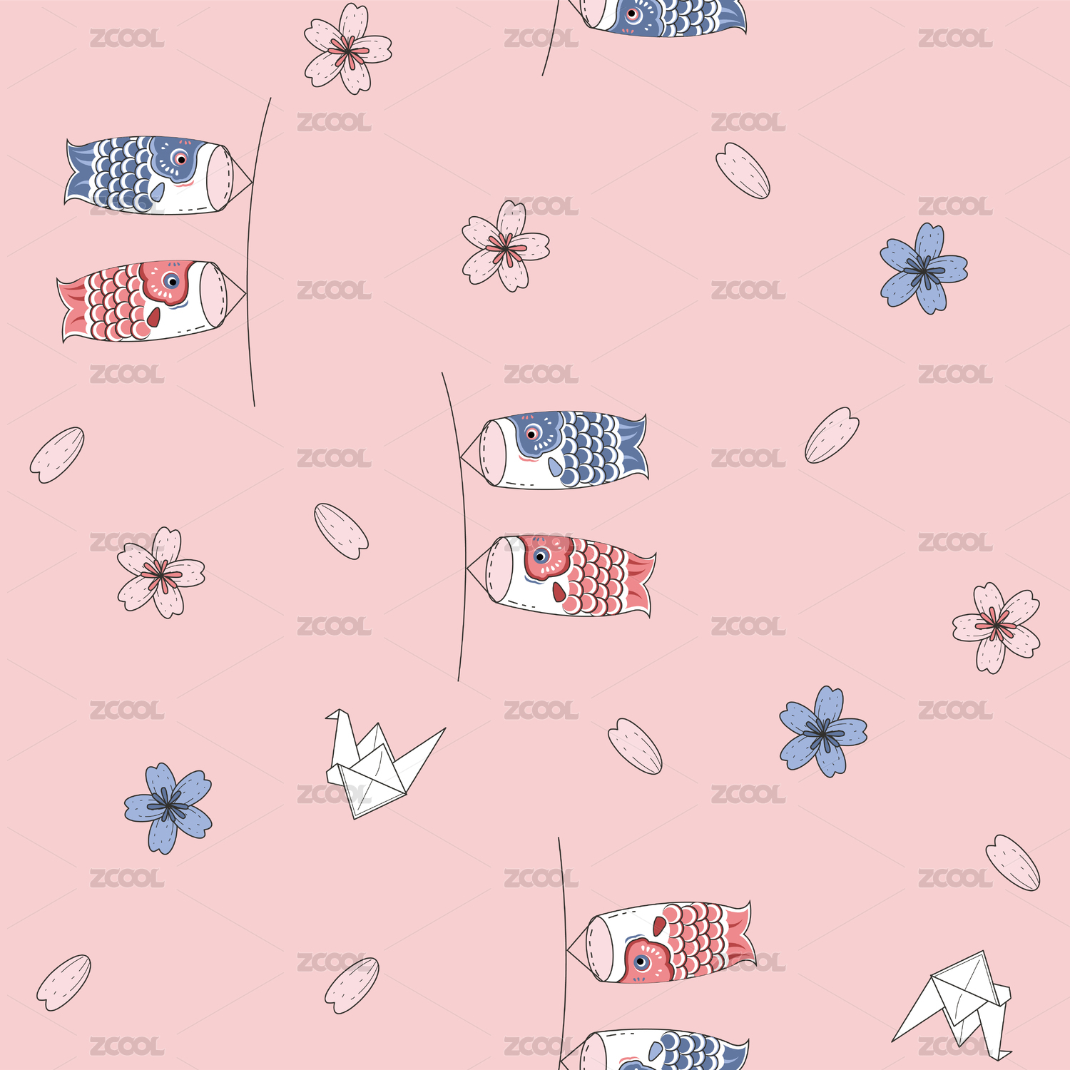 可爱日系和风樱花鲤鱼旗无缝背景印花图案