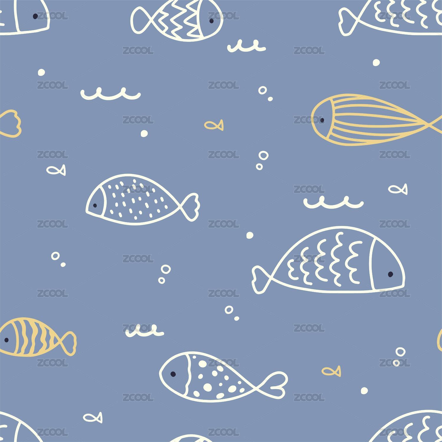 手绘可爱卡通小鱼猫脚印家纺服装印花图案