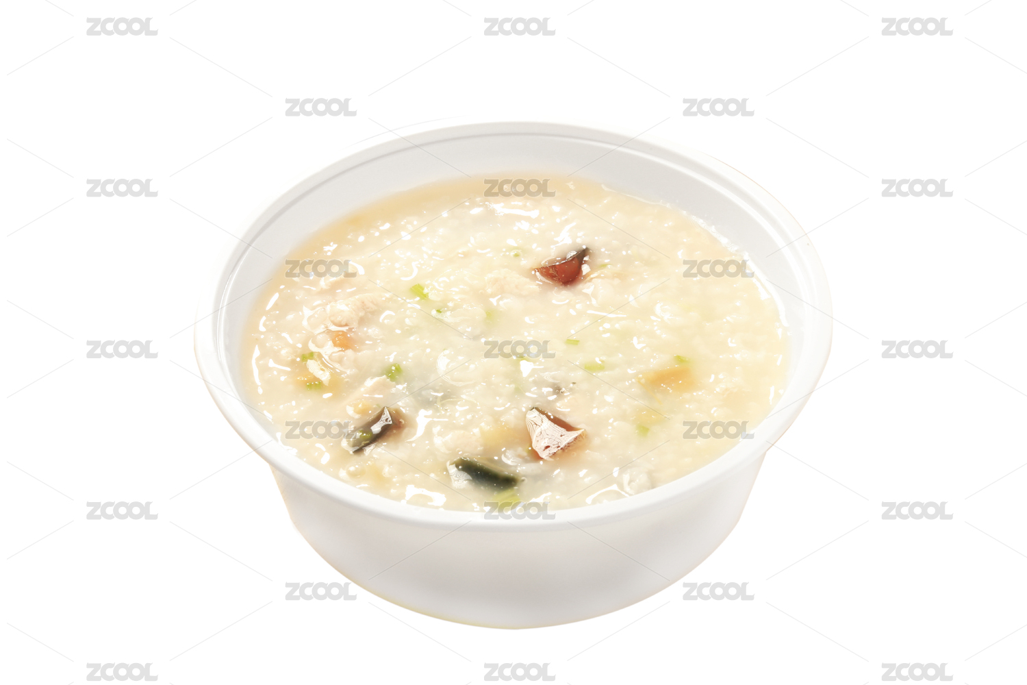 白色背景上白色打包盒中的皮蛋瘦肉粥