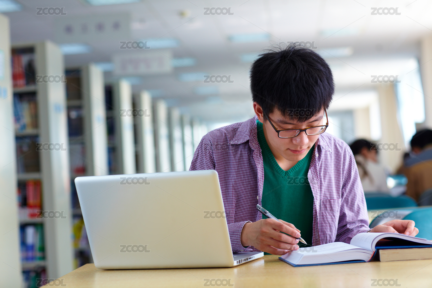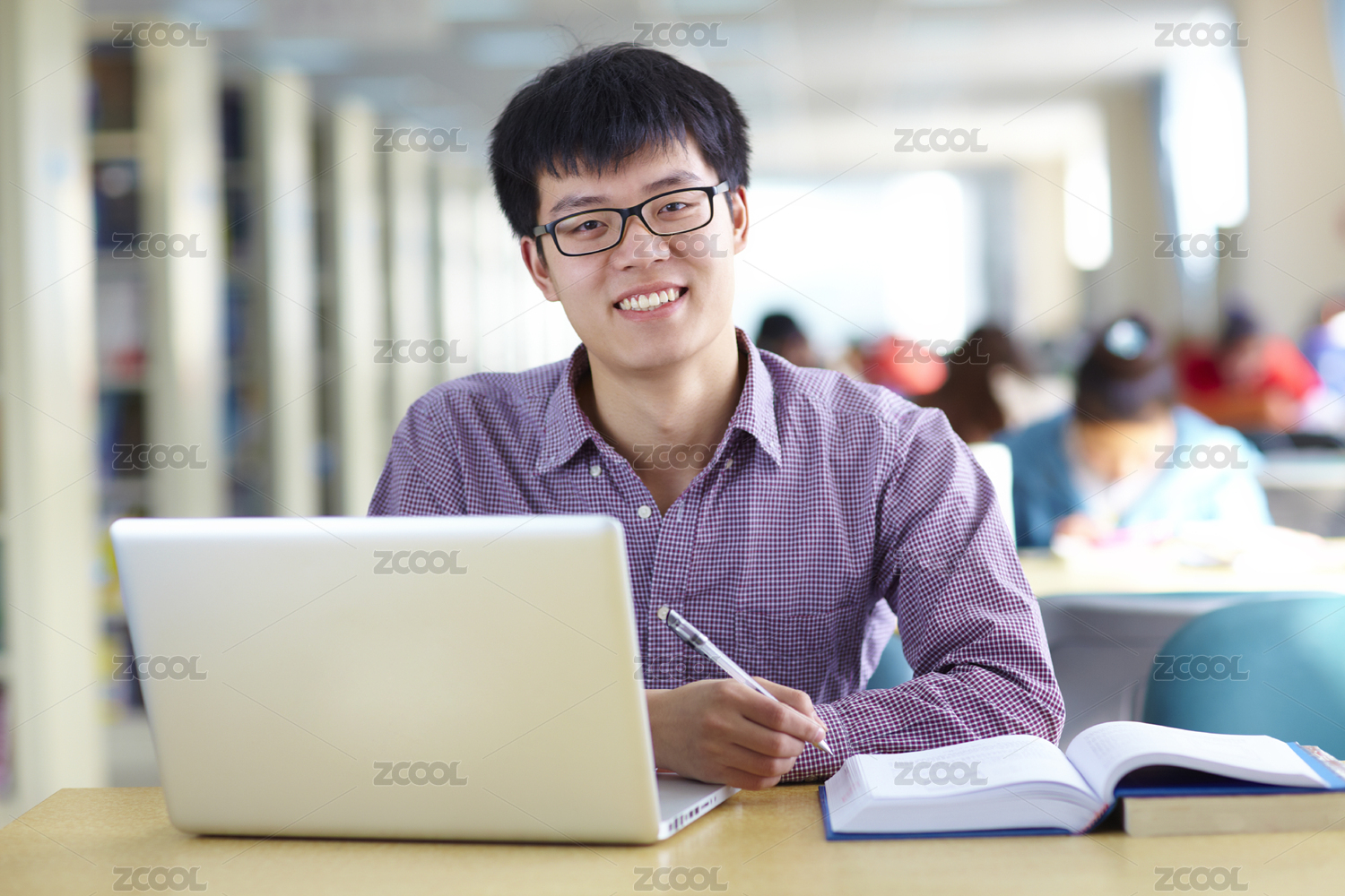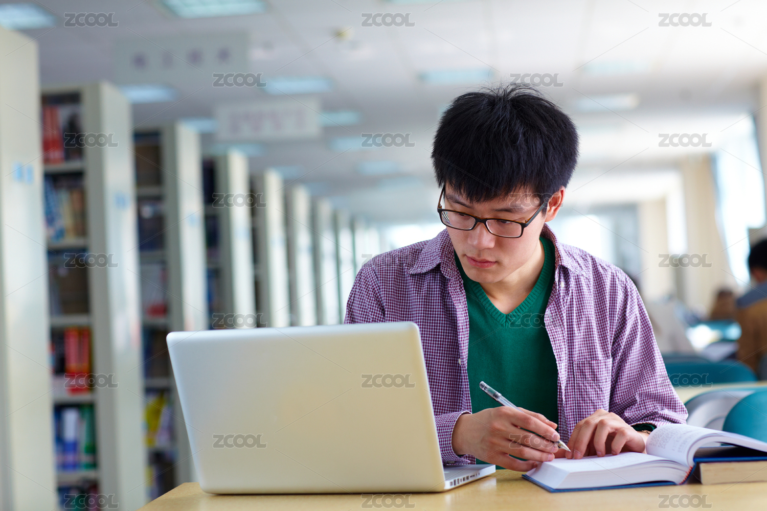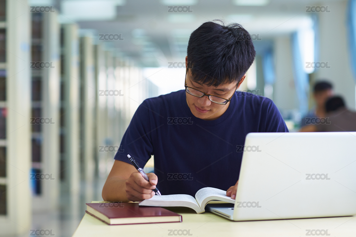 与笔记本电脑库中的一个男性的亚洲大学生研究
