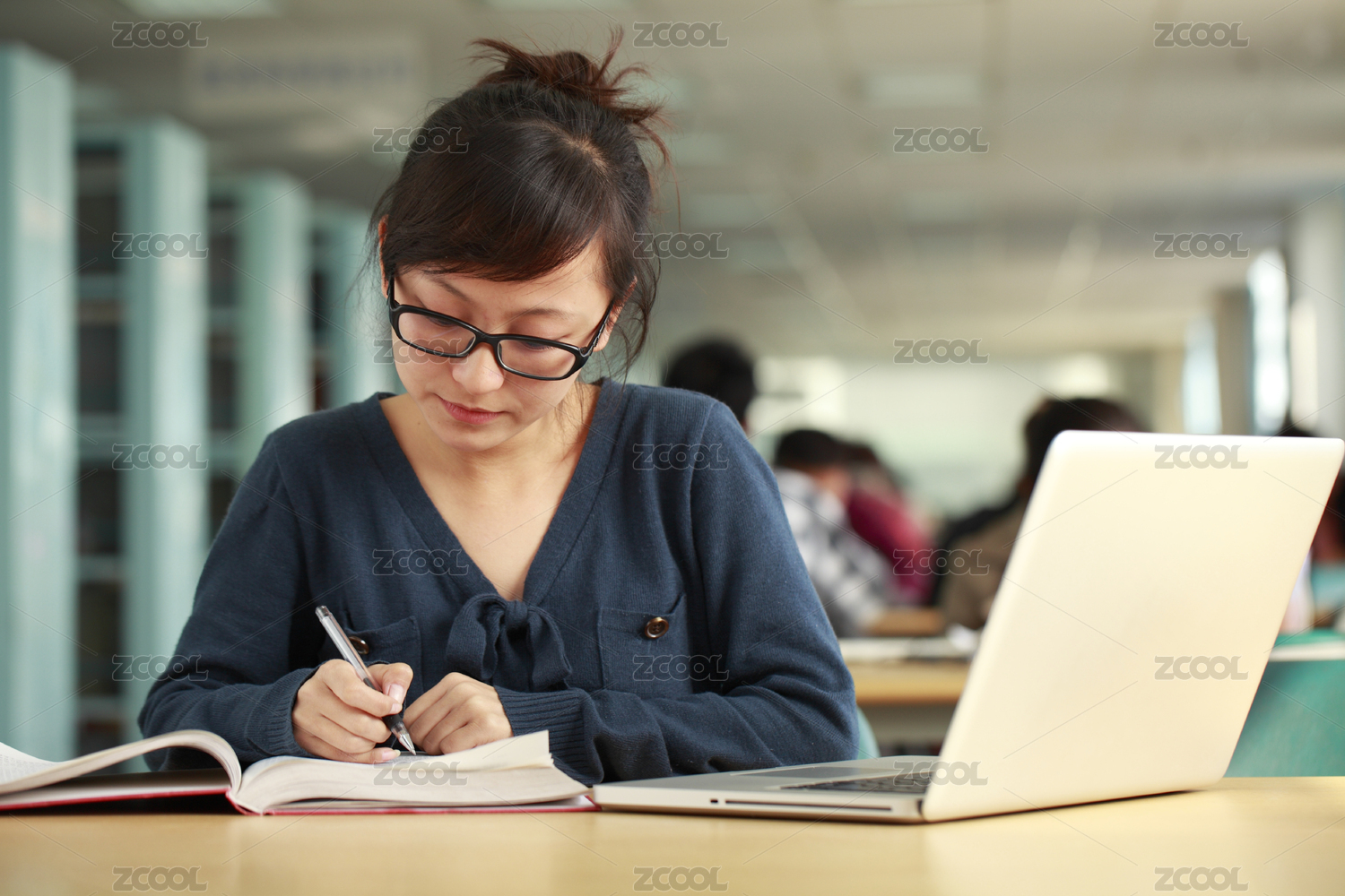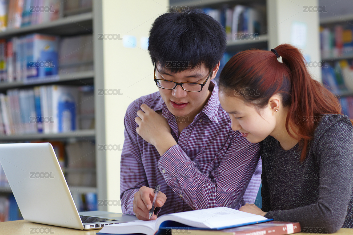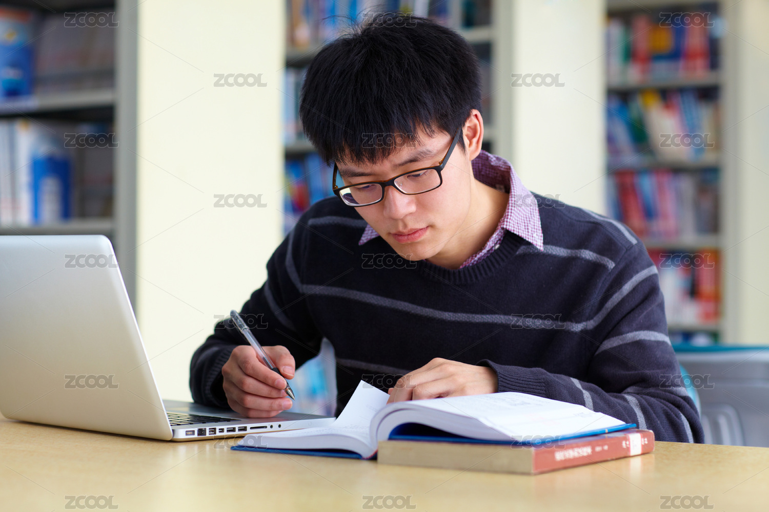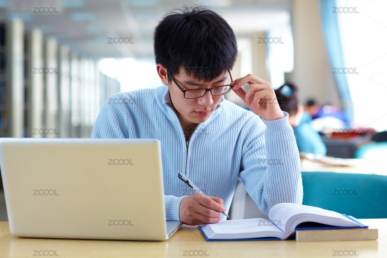 与笔记本电脑库中的一个男性的亚洲大学生研究