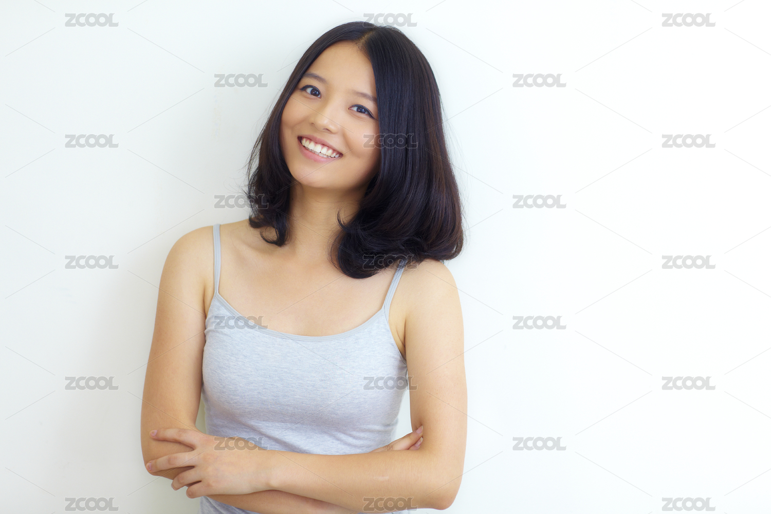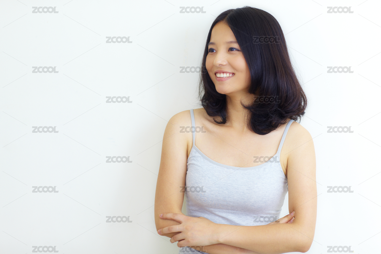 一个年轻的亚洲女子在墙上的画像靠在