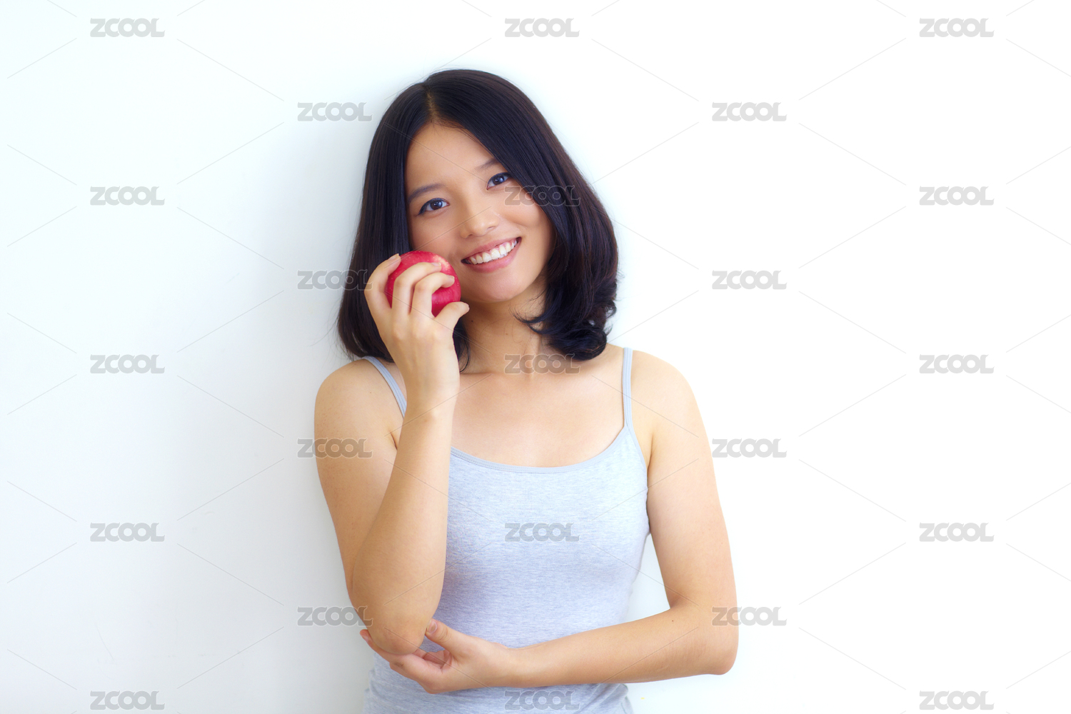 一个年轻的亚洲女子拿着一个苹果看着镜头微笑升