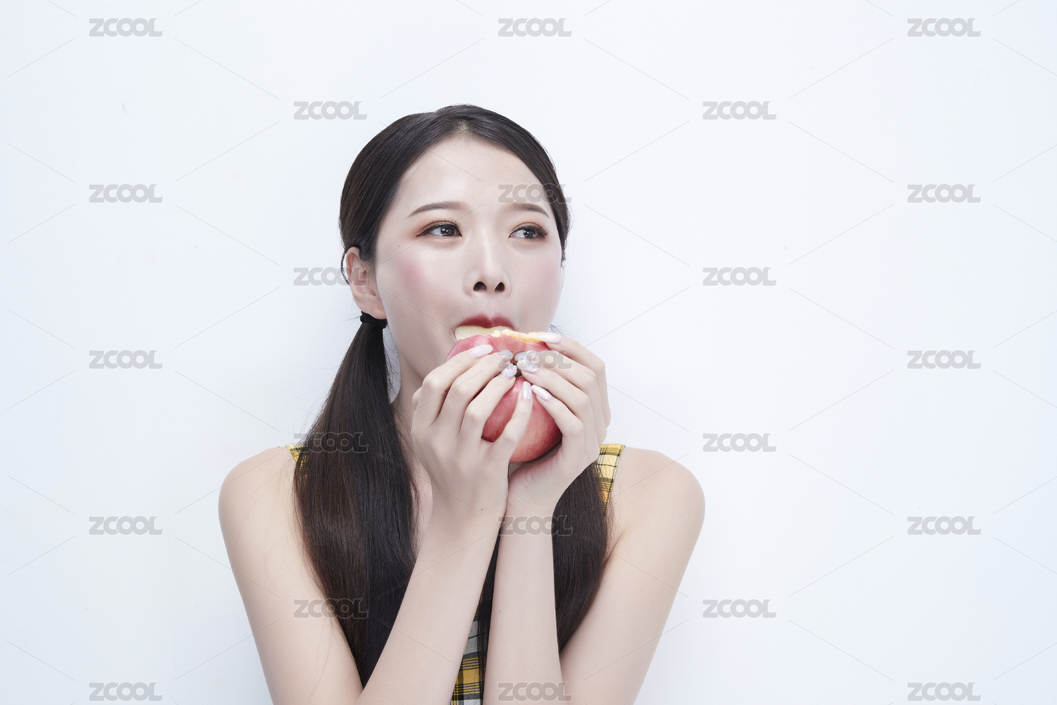 啃咬苹果身穿格子吊带裙的亚洲可爱少女人像