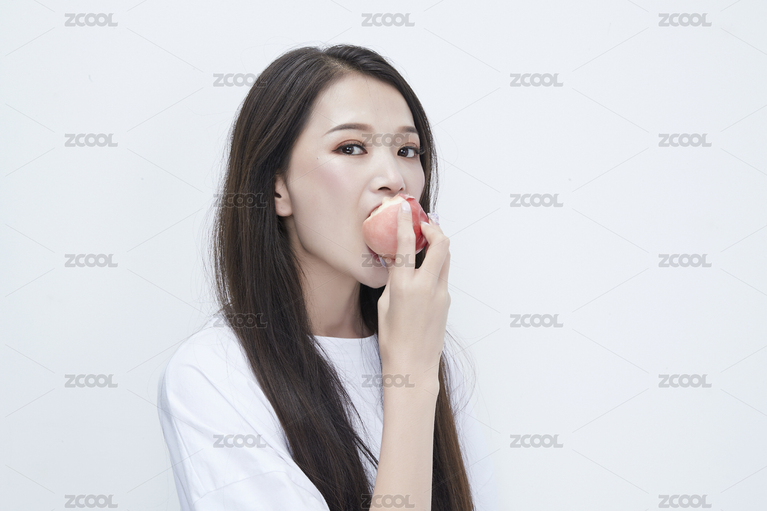 吃桃子的穿白色长T血衫的长发可爱少女人像