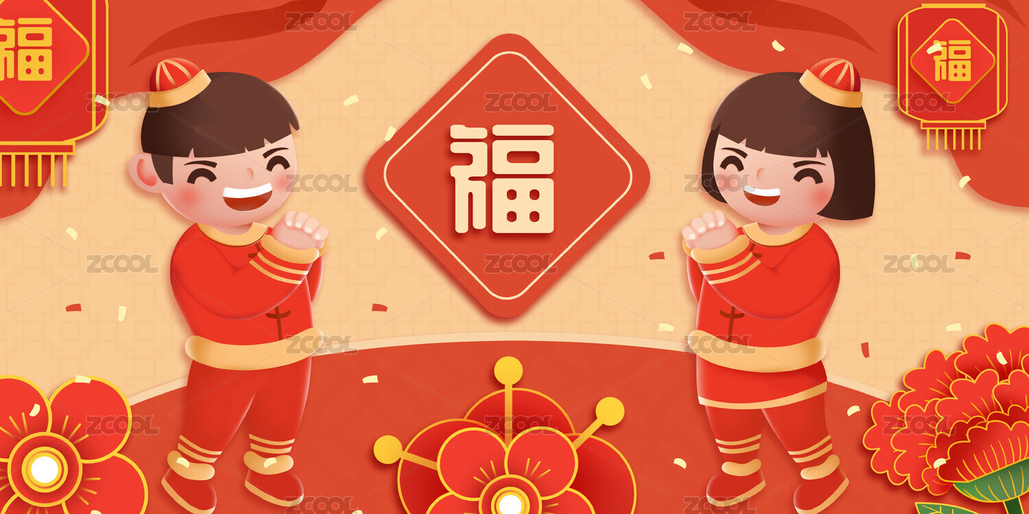 红色,新年,春节,年画,龙年,卷轴,卡通,水彩,描边,祝福