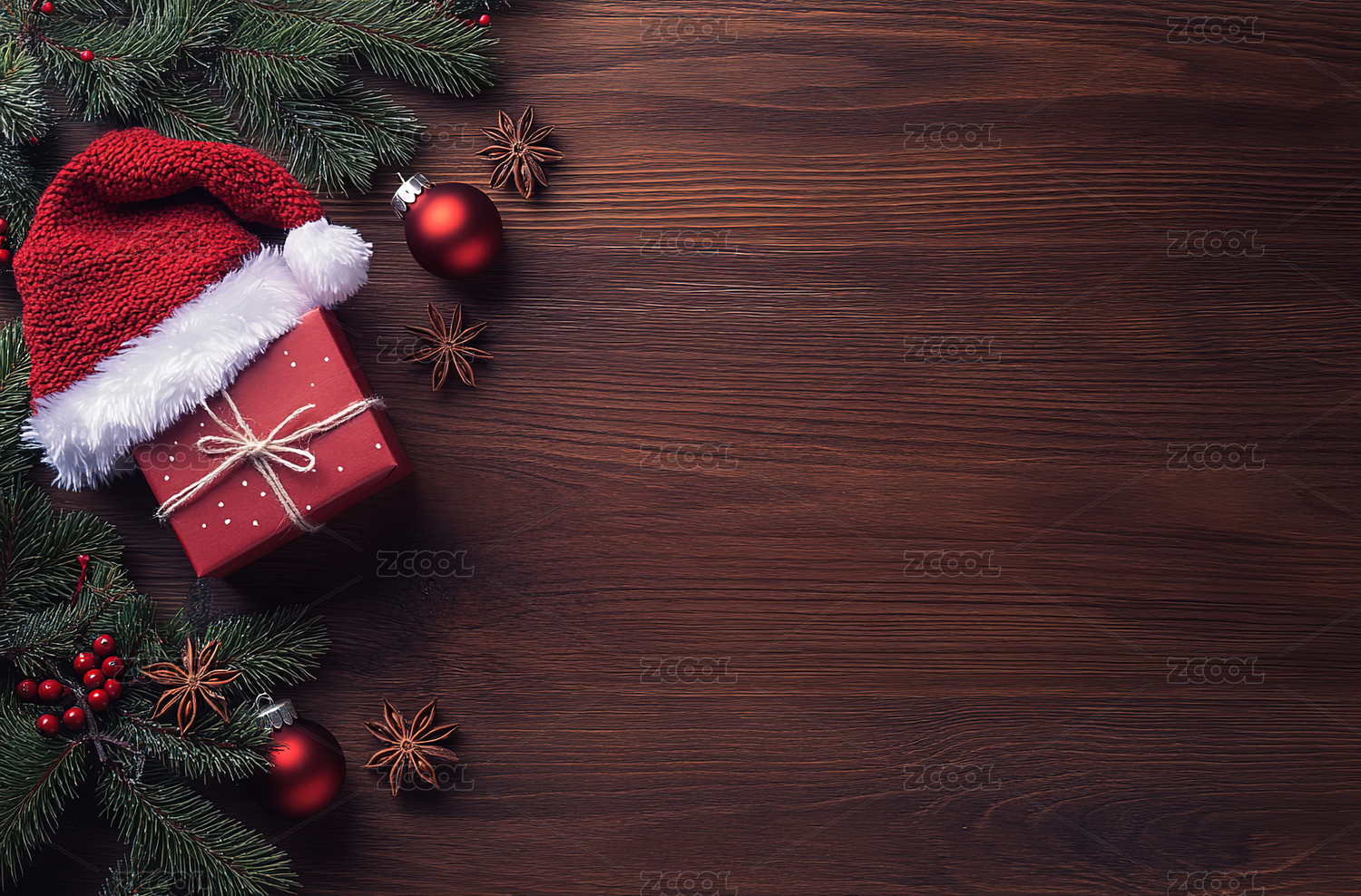 木桌面上的圣诞装饰物和礼盒,背景素材