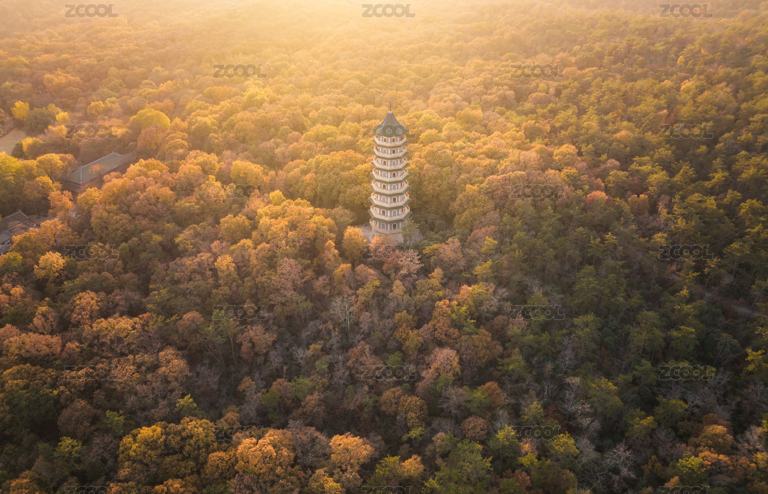 日落时南京紫金山脚下的灵谷寺灵谷塔航拍