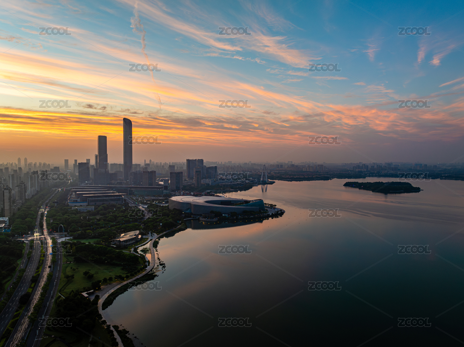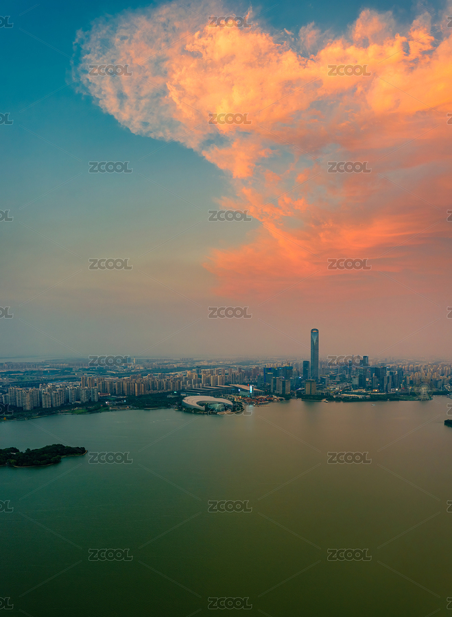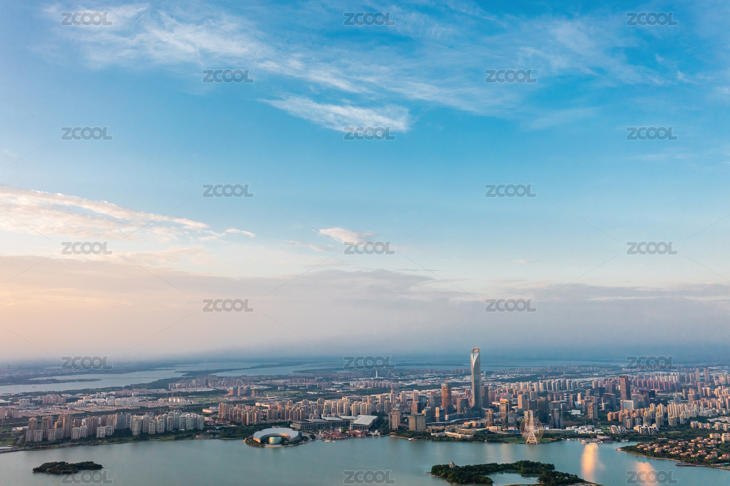 中国江苏苏州金鸡湖景区傍晚城市风光