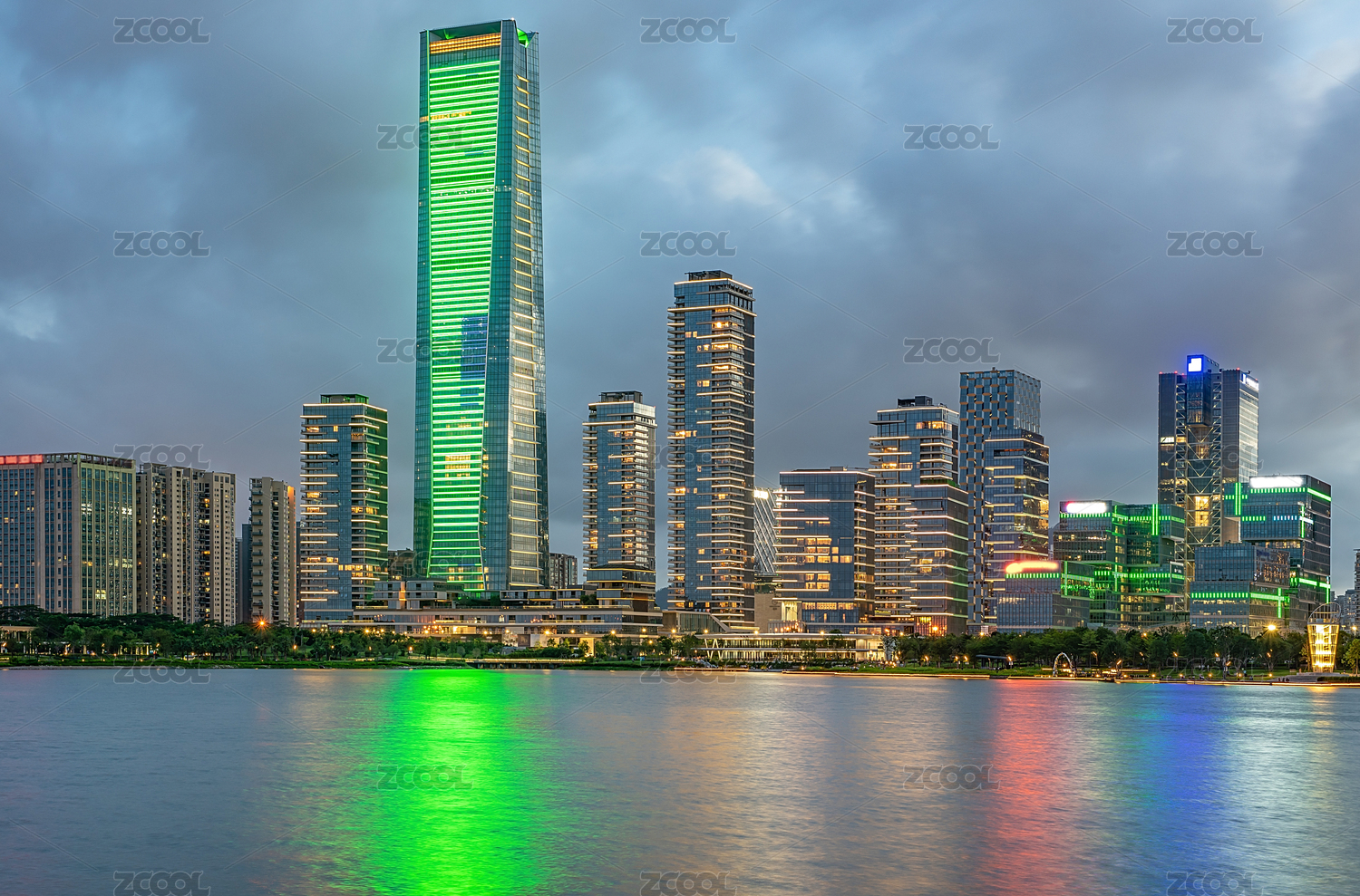 傍晚有彩霞的中国深圳湾后海的城市建筑群高楼大厦风光
