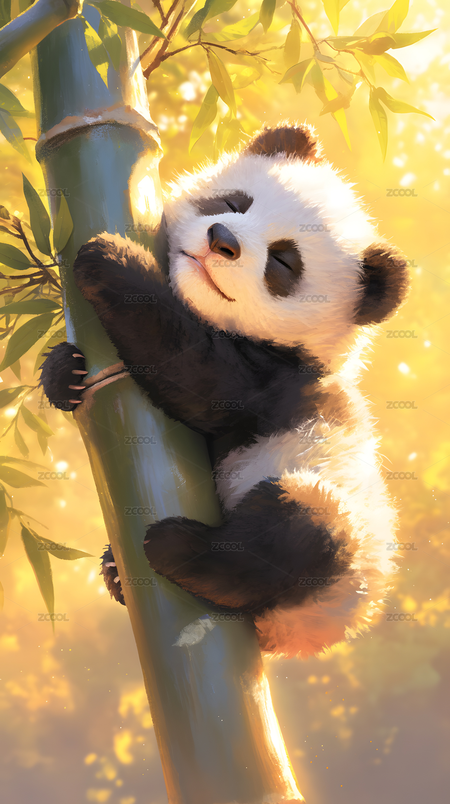 熊猫依偎竹子阳光洒落